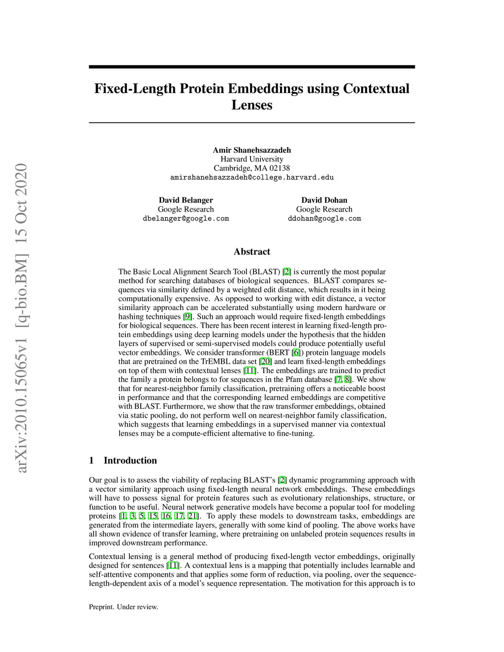 The Basic Local Alignment Search Tool (BLAST) is currently the most popular method for searching databases of biological sequences. BLAST compares sequences via similarity defined by a weighted edit distance, which results in it being computationally expensive. As opposed to working with edit distance, a vector similarity approach can be accelerated substantially using modern hardware or hashing techniques. Such an approach would require fixed-length embeddings for biological sequences. There has been recent interest in learning fixed-length protein embeddings using deep learning models under the hypothesis that the hidden layers of supervised or semi-supervised models could produce potentially useful vector embeddings. We consider transformer (BERT) protein language models that are pretrained on the TrEMBL data set and learn fixed-length embeddings on top of them with contextual lenses. The embeddings are trained to predict the family a protein belongs to for sequences in the Pfam database. We show that for nearest-neighbor family classification, pretraining offers a noticeable boost in performance and that the corresponding learned embeddings are competitive with BLAST. Furthermore, we show that the raw transformer embeddings, obtained via static pooling, do not perform well on nearest-neighbor family classification, which suggests that learning embeddings in a supervised manner via contextual lenses may be a compute-efficient alternative to fine-tuning.