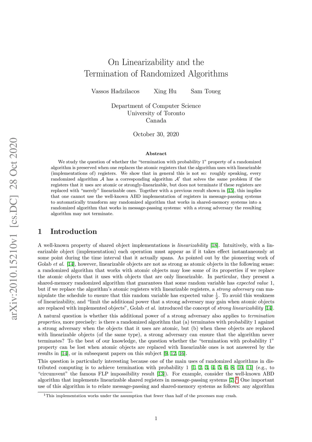 We study the question of whether the "termination with probability 1" property of a randomized algorithm is preserved when one replaces the atomic registers that the algorithm uses with linearizable (implementations of) registers. We show that in general this is not so: roughly speaking, every randomized algorithm A has a corresponding algorithm A' that solves the same problem if the registers that it uses are atomic or strongly-linearizable, but does not terminate if these registers are replaced with "merely" linearizable ones. Together with a previous result shown in [15], this implies that one cannot use the well-known ABD implementation of registers in message-passing systems to automatically transform any randomized algorithm that works in shared-memory systems into a randomized algorithm that works in message-passing systems: with a strong adversary the resulting algorithm may not terminate.