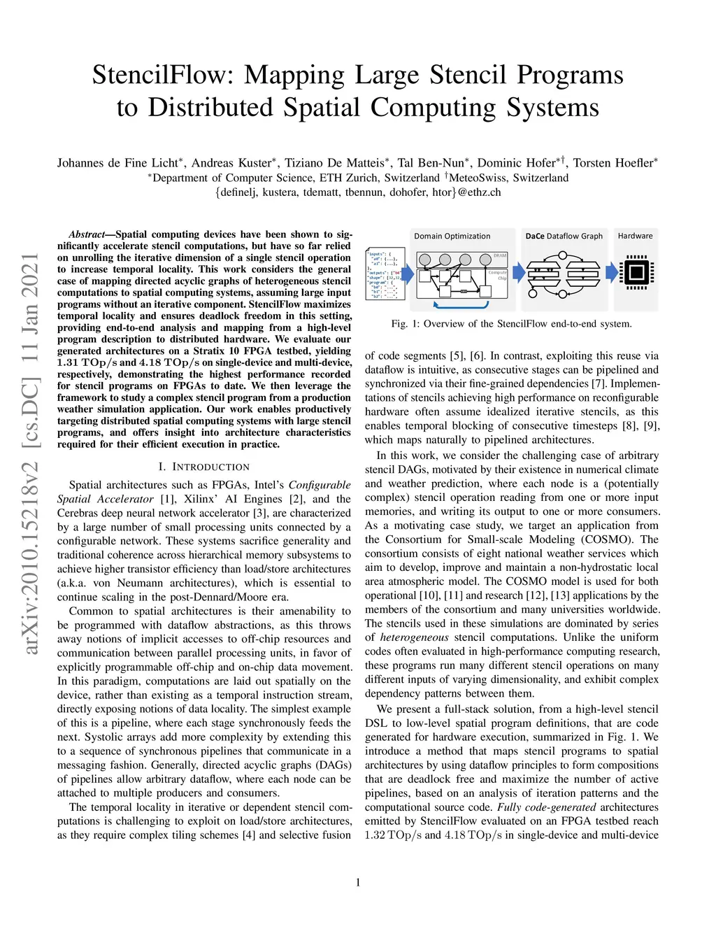 Spatial computing devices have been shown to significantly accelerate stencil computations, but have so far relied on unrolling the iterative dimension of a single stencil operation to increase temporal locality. This work considers the general case of mapping directed acyclic graphs of heterogeneous stencil computations to spatial computing systems, assuming large input programs without an iterative component. StencilFlow maximizes temporal locality and ensures deadlock freedom in this setting, providing end-to-end analysis and mapping from a high-level program description to distributed hardware. We evaluate our generated architectures on a Stratix 10 FPGA testbed, yielding 1.31 TOp/s and 4.18 TOp/s on single-device and multi-device, respectively, demonstrating the highest performance recorded for stencil programs on FPGAs to date. We then leverage the framework to study a complex stencil program from a production weather simulation application. Our work enables productively targeting distributed spatial computing systems with large stencil programs, and offers insight into architecture characteristics required for their efficient execution in practice.