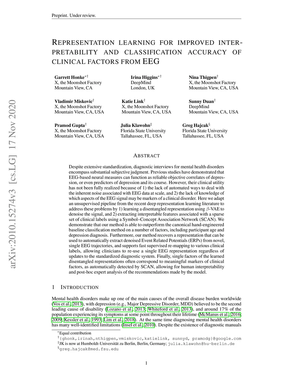 Despite extensive standardization, diagnostic interviews for mental health disorders encompass substantial subjective judgment. Previous studies have demonstrated that EEG-based neural measures can function as reliable objective correlates of depression, or even predictors of depression and its course. However, their clinical utility has not been fully realized because of 1) the lack of automated ways to deal with the inherent noise associated with EEG data at scale, and 2) the lack of knowledge of which aspects of the EEG signal may be markers of a clinical disorder. Here we adapt an unsupervised pipeline from the recent deep representation learning literature to address these problems by 1) learning a disentangled representation using -VAE to denoise the signal, and 2) extracting interpretable features associated with a sparse set of clinical labels using a Symbol-Concept Association Network (SCAN). We demonstrate that our method is able to outperform the canonical hand-engineered baseline classification method on a number of factors, including participant age and depression diagnosis. Furthermore, our method recovers a representation that can be used to automatically extract denoised Event Related Potentials (ERPs) from novel, single EEG trajectories, and supports fast supervised re-mapping to various clinical labels, allowing clinicians to re-use a single EEG representation regardless of updates to the standardized diagnostic system. Finally, single factors of the learned disentangled representations often correspond to meaningful markers of clinical factors, as automatically detected by SCAN, allowing for human interpretability and post-hoc expert analysis of the recommendations made by the model.
