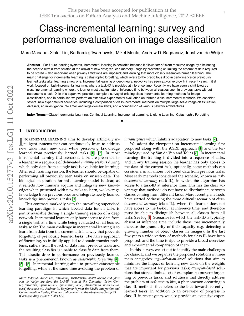 For future learning systems, incremental learning is desirable because it allows for: efficient resource usage by eliminating the need to retrain from scratch at the arrival of new data; reduced memory usage by preventing or limiting the amount of data required to be stored -- also important when privacy limitations are imposed; and learning that more closely resembles human learning. The main challenge for incremental learning is catastrophic forgetting, which refers to the precipitous drop in performance on previously learned tasks after learning a new one. Incremental learning of deep neural networks has seen explosive growth in recent years. Initial work focused on task-incremental learning, where a task-ID is provided at inference time. Recently, we have seen a shift towards class-incremental learning where the learner must discriminate at inference time between all classes seen in previous tasks without recourse to a task-ID. In this paper, we provide a complete survey of existing class-incremental learning methods for image classification, and in particular, we perform an extensive experimental evaluation on thirteen class-incremental methods. We consider several new experimental scenarios, including a comparison of class-incremental methods on multiple large-scale image classification datasets, an investigation into small and large domain shifts, and a comparison of various network architectures.