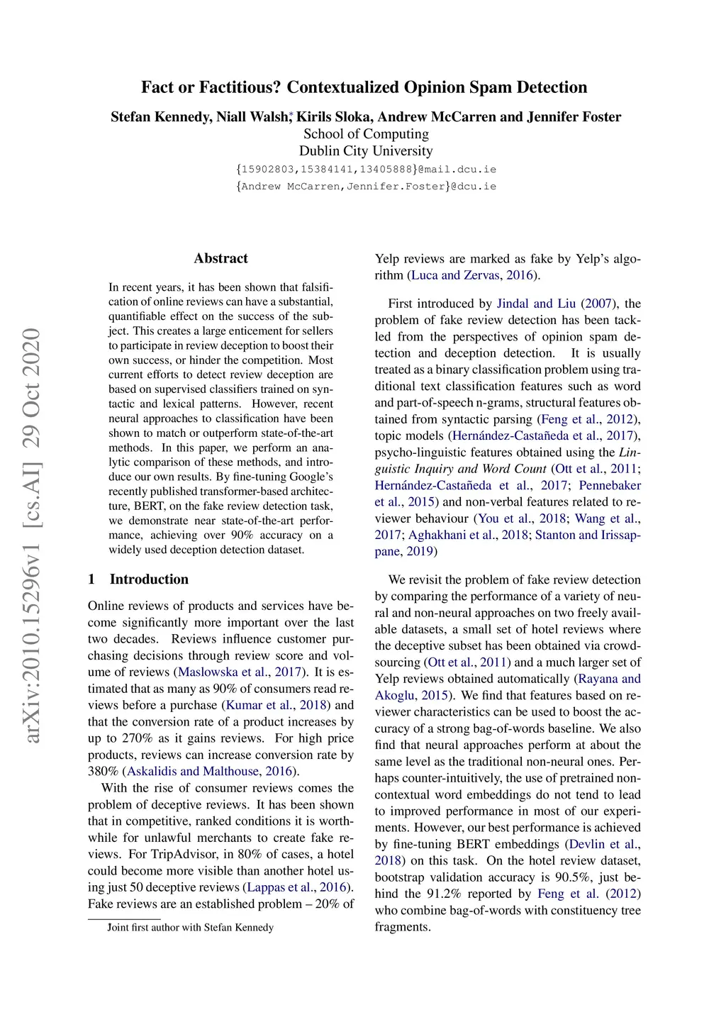 In this paper we perform an analytic comparison of a number of techniques used to detect fake and deceptive online reviews. We apply a number machine learning approaches found to be effective, and introduce our own approach by fine-tuning state of the art contextualised embeddings. The results we obtain show the potential of contextualised embeddings for fake review detection, and lay the groundwork for future research in this area.