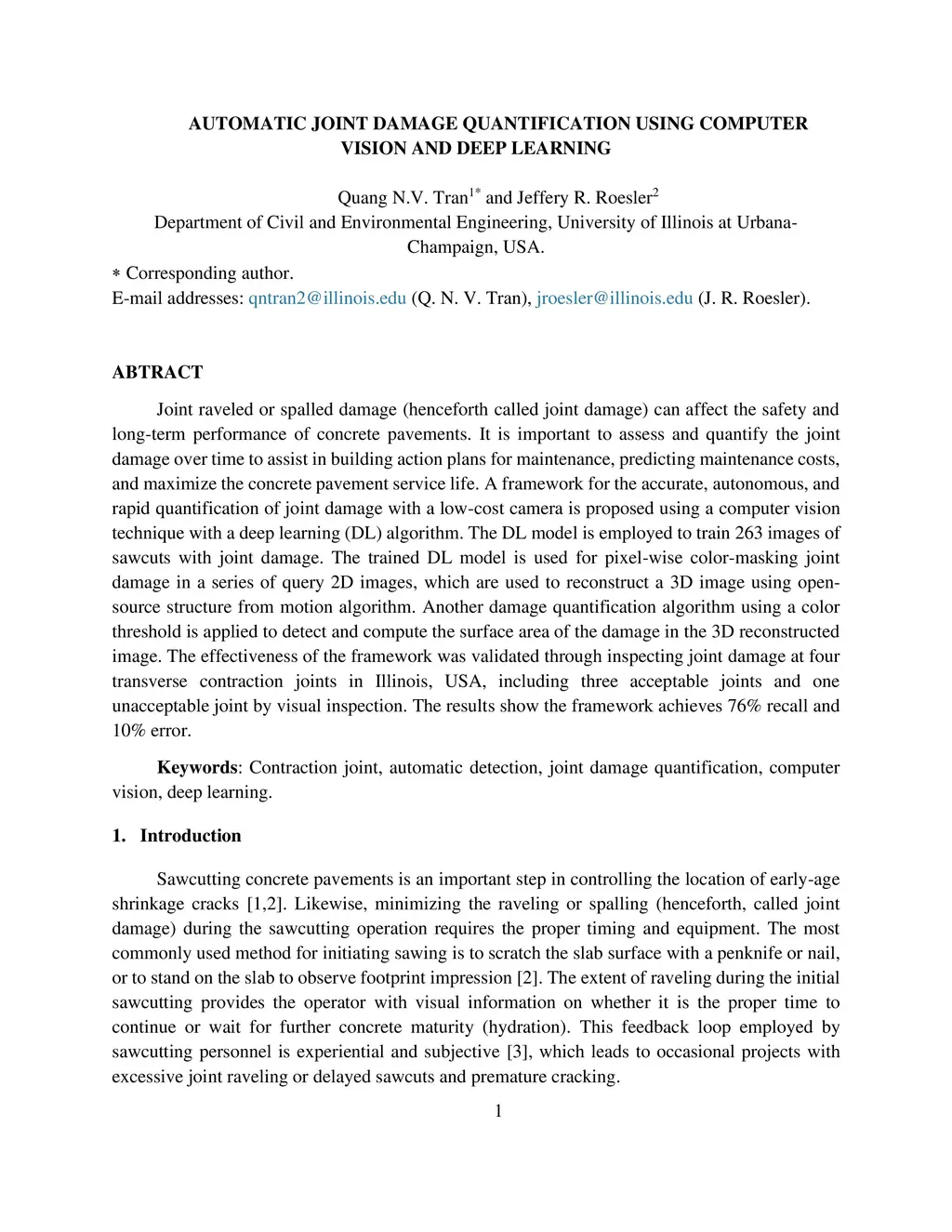 Joint raveled or spalled damage (henceforth called joint damage) can affect the safety and long-term performance of concrete pavements. It is important to assess and quantify the joint damage over time to assist in building action plans for maintenance, predicting maintenance costs, and maximize the concrete pavement service life. A framework for the accurate, autonomous, and rapid quantification of joint damage with a low-cost camera is proposed using a computer vision technique with a deep learning (DL) algorithm. The DL model is employed to train 263 images of sawcuts with joint damage. The trained DL model is used for pixel-wise color-masking joint damage in a series of query 2D images, which are used to reconstruct a 3D image using open-source structure from motion algorithm. Another damage quantification algorithm using a color threshold is applied to detect and compute the surface area of the damage in the 3D reconstructed image. The effectiveness of the framework was validated through inspecting joint damage at four transverse contraction joints in Illinois, USA, including three acceptable joints and one unacceptable joint by visual inspection. The results show the framework achieves 76% recall and 10% error.