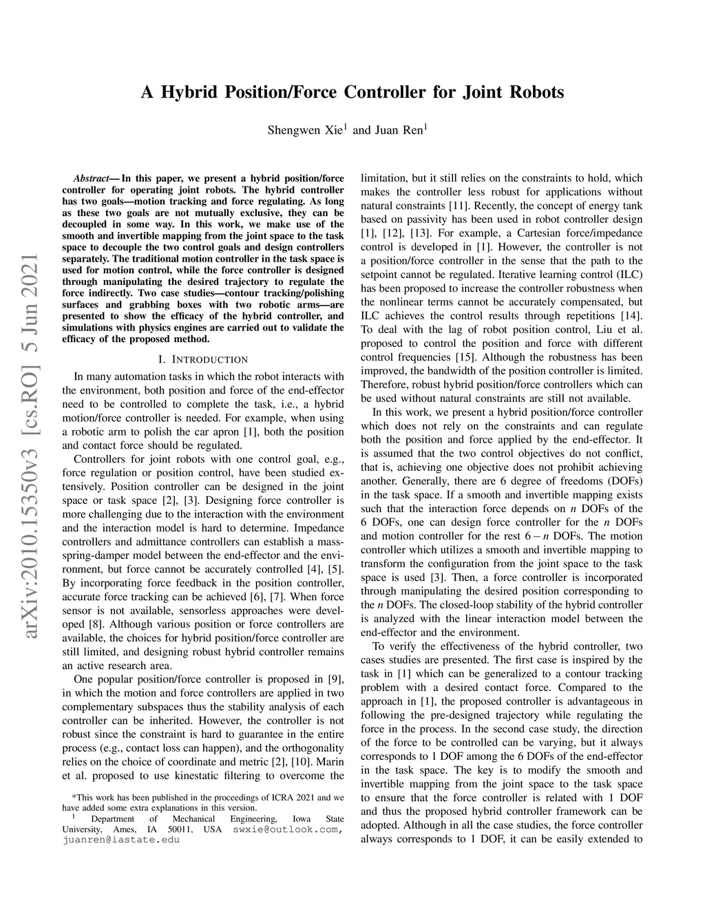 A Hybrid Position/Force Controller for Joint Robots