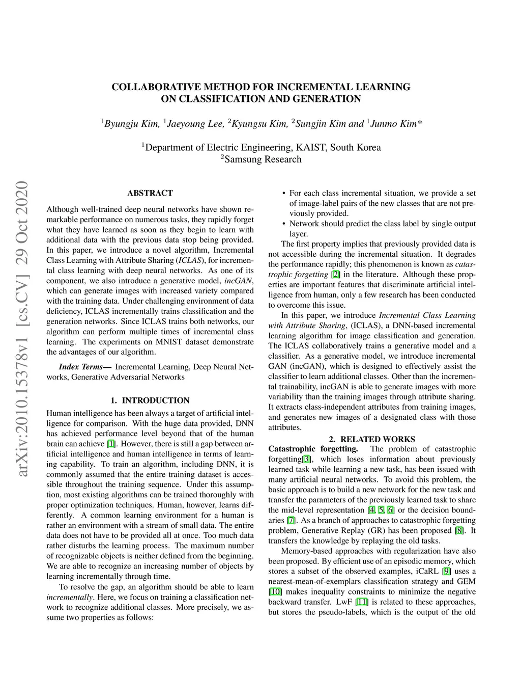 Although well-trained deep neural networks have shown remarkable performance on numerous tasks, they rapidly forget what they have learned as soon as they begin to learn with additional data with the previous data stop being provided. In this paper, we introduce a novel algorithm, Incremental Class Learning with Attribute Sharing (ICLAS), for incremental class learning with deep neural networks. As one of its component, we also introduce a generative model, incGAN, which can generate images with increased variety compared with the training data. Under challenging environment of data deficiency, ICLAS incrementally trains classification and the generation networks. Since ICLAS trains both networks, our algorithm can perform multiple times of incremental class learning. The experiments on MNIST dataset demonstrate the advantages of our algorithm.