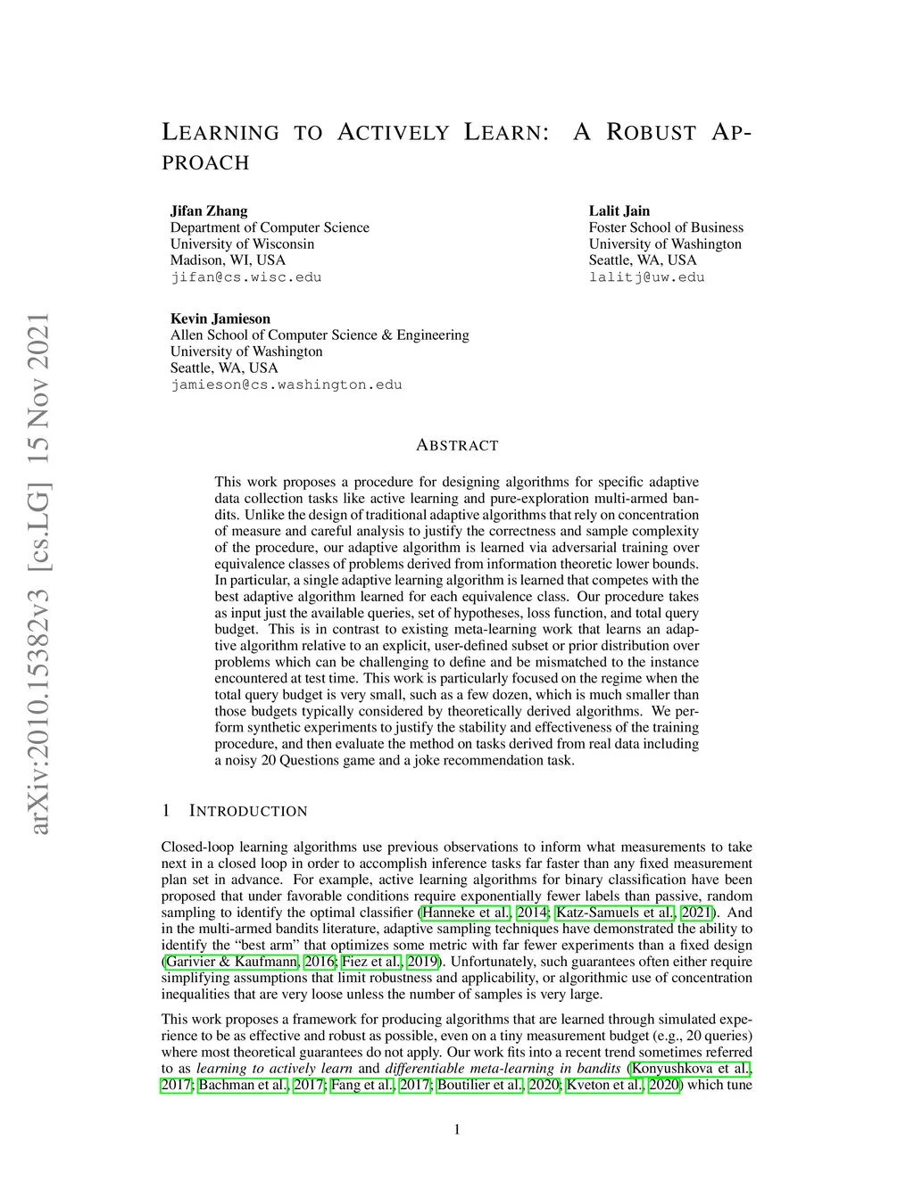 This work proposes a procedure for designing algorithms for specific adaptive data collection tasks like active learning and pure-exploration multi-armed bandits. Unlike the design of traditional adaptive algorithms that rely on concentration of measure and careful analysis to justify the correctness and sample complexity of the procedure, our adaptive algorithm is learned via adversarial training over equivalence classes of problems derived from information theoretic lower bounds. In particular, a single adaptive learning algorithm is learned that competes with the best adaptive algorithm learned for each equivalence class. Our procedure takes as input just the available queries, set of hypotheses, loss function, and total query budget. This is in contrast to existing meta-learning work that learns an adaptive algorithm relative to an explicit, user-defined subset or prior distribution over problems which can be challenging to define and be mismatched to the instance encountered at test time. This work is particularly focused on the regime when the total query budget is very small, such as a few dozen, which is much smaller than those budgets typically considered by theoretically derived algorithms. We perform synthetic experiments to justify the stability and effectiveness of the training procedure, and then evaluate the method on tasks derived from real data including a noisy 20 Questions game and a joke recommendation task.