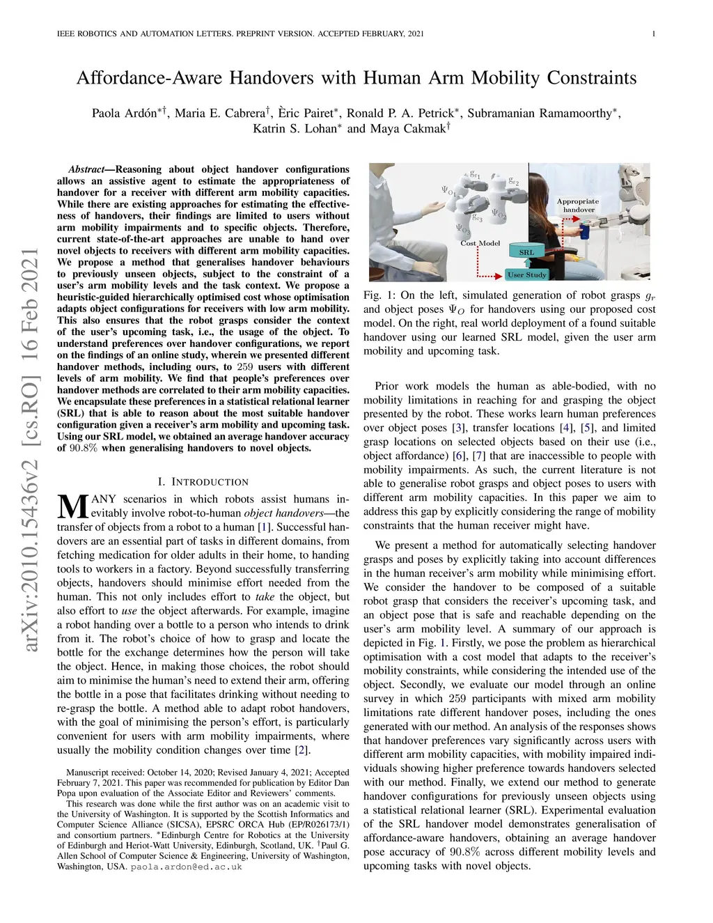 Reasoning about object handover configurations allows an assistive agent to estimate the appropriateness of handover for a receiver with different arm mobility capacities. While there are existing approaches for estimating the effectiveness of handovers, their findings are limited to users without arm mobility impairments and to specific objects. Therefore, current state-of-the-art approaches are unable to hand over novel objects to receivers with different arm mobility capacities. We propose a method that generalises handover behaviours to previously unseen objects, subject to the constraint of a user's arm mobility levels and the task context. We propose a heuristic-guided hierarchically optimised cost whose optimisation adapts object configurations for receivers with low arm mobility. This also ensures that the robot grasps consider the context of the user's upcoming task, i.e., the usage of the object. To understand preferences over handover configurations, we report on the findings of an online study, wherein we presented different handover methods, including ours, to users with different levels of arm mobility. We find that people's preferences over handover methods are correlated to their arm mobility capacities. We encapsulate these preferences in a statistical relational model (SRL) that is able to reason about the most suitable handover configuration given a receiver's arm mobility and upcoming task. Using our SRL model, we obtained an average handover accuracy of when generalising handovers to novel objects.