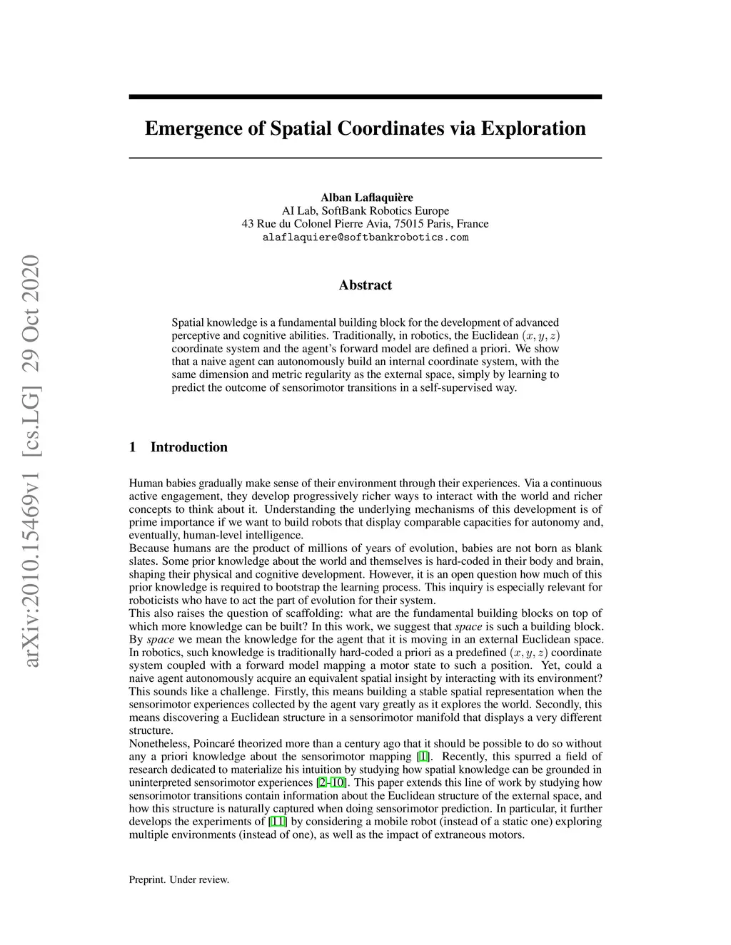Spatial knowledge is a fundamental building block for the development of advanced perceptive and cognitive abilities. Traditionally, in robotics, the Euclidean (x,y,z) coordinate system and the agent's forward model are defined a priori. We show that a naive agent can autonomously build an internal coordinate system, with the same dimension and metric regularity as the external space, simply by learning to predict the outcome of sensorimotor transitions in a self-supervised way.