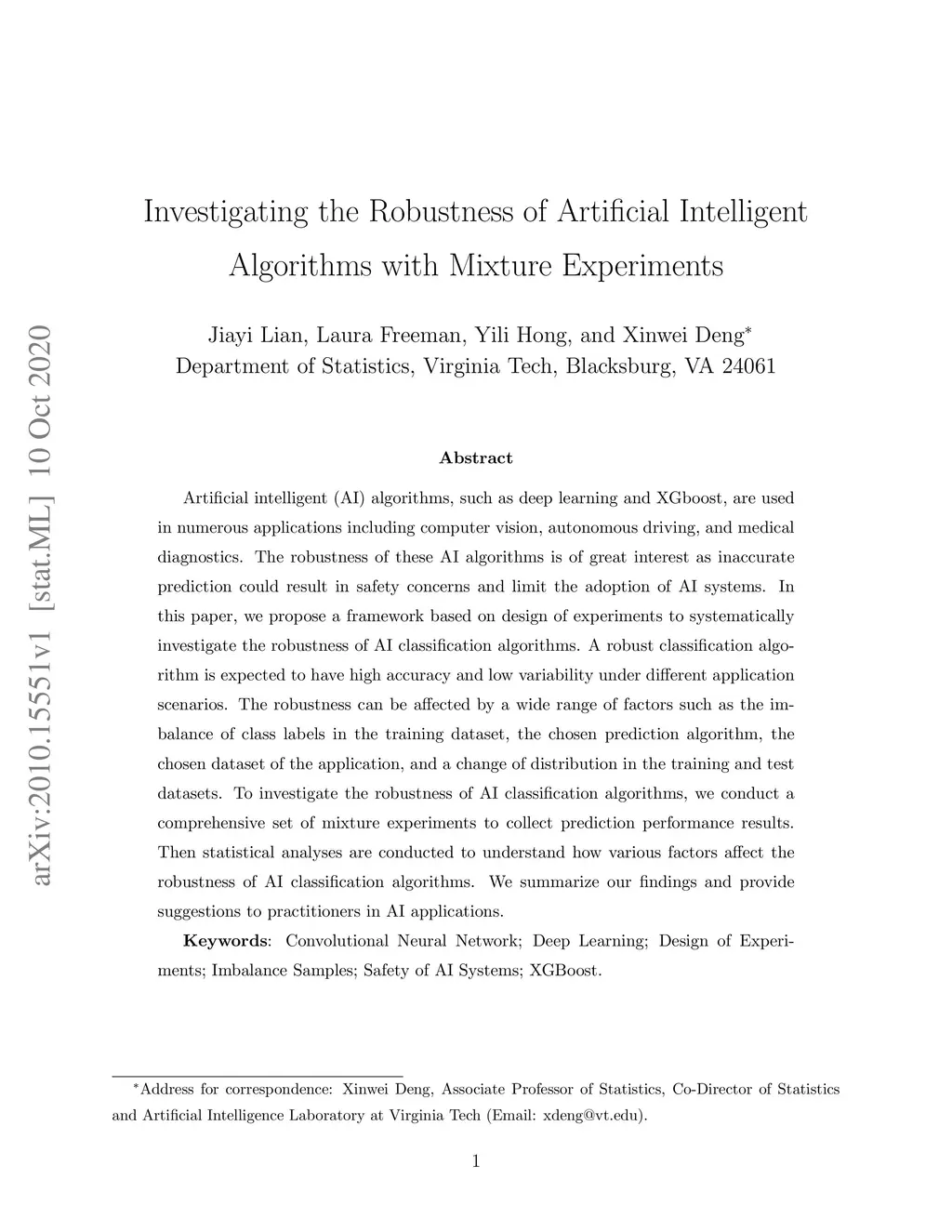 Artificial intelligent (AI) algorithms, such as deep learning and XGboost, are used in numerous applications including computer vision, autonomous driving, and medical diagnostics. The robustness of these AI algorithms is of great interest as inaccurate prediction could result in safety concerns and limit the adoption of AI systems. In this paper, we propose a framework based on design of experiments to systematically investigate the robustness of AI classification algorithms. A robust classification algorithm is expected to have high accuracy and low variability under different application scenarios. The robustness can be affected by a wide range of factors such as the imbalance of class labels in the training dataset, the chosen prediction algorithm, the chosen dataset of the application, and a change of distribution in the training and test datasets. To investigate the robustness of AI classification algorithms, we conduct a comprehensive set of mixture experiments to collect prediction performance results. Then statistical analyses are conducted to understand how various factors affect the robustness of AI classification algorithms. We summarize our findings and provide suggestions to practitioners in AI applications.