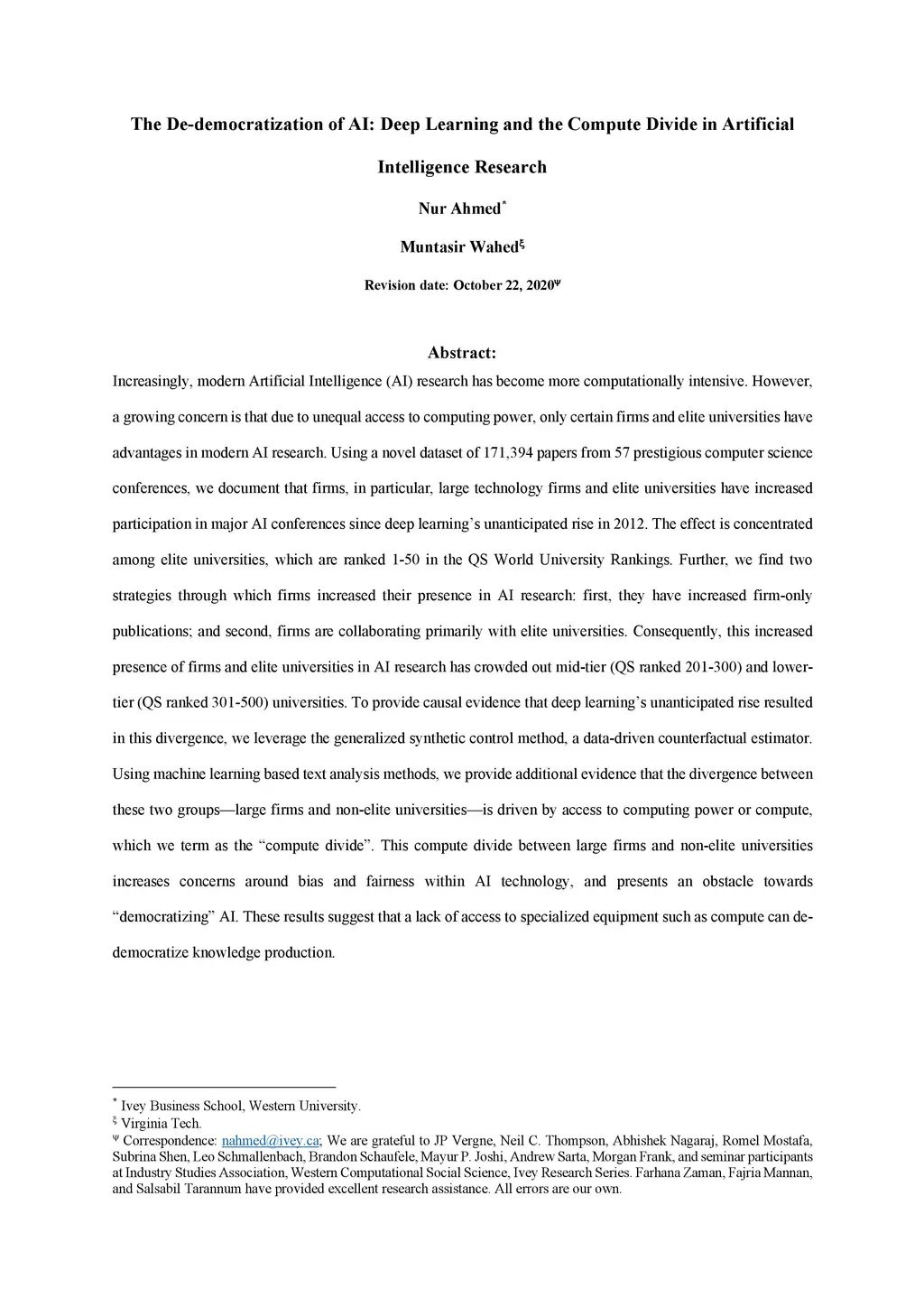 Increasingly, modern Artificial Intelligence (AI) research has become more computationally intensive. However, a growing concern is that due to unequal access to computing power, only certain firms and elite universities have advantages in modern AI research. Using a novel dataset of 171394 papers from 57 prestigious computer science conferences, we document that firms, in particular, large technology firms and elite universities have increased participation in major AI conferences since deep learning's unanticipated rise in 2012. The effect is concentrated among elite universities, which are ranked 1-50 in the QS World University Rankings. Further, we find two strategies through which firms increased their presence in AI research: first, they have increased firm-only publications; and second, firms are collaborating primarily with elite universities. Consequently, this increased presence of firms and elite universities in AI research has crowded out mid-tier (QS ranked 201-300) and lower-tier (QS ranked 301-500) universities. To provide causal evidence that deep learning's unanticipated rise resulted in this divergence, we leverage the generalized synthetic control method, a data-driven counterfactual estimator. Using machine learning based text analysis methods, we provide additional evidence that the divergence between these two groups - large firms and non-elite universities - is driven by access to computing power or compute, which we term as the "compute divide". This compute divide between large firms and non-elite universities increases concerns around bias and fairness within AI technology, and presents an obstacle towards "democratizing" AI. These results suggest that a lack of access to specialized equipment such as compute can de-democratize knowledge production.