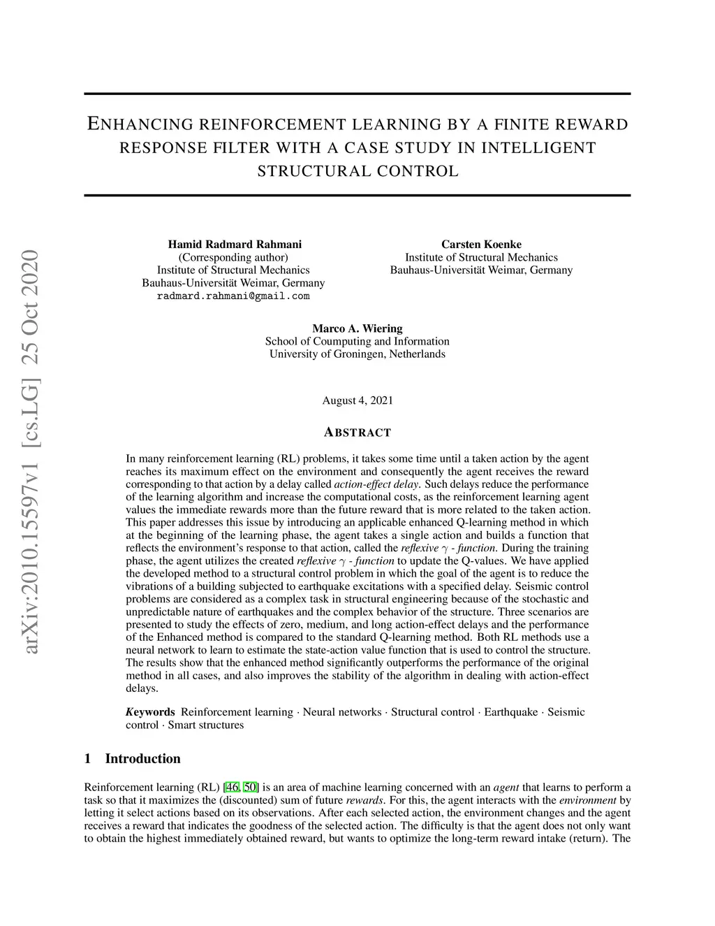 In many reinforcement learning (RL) problems, it takes some time until a taken action by the agent reaches its maximum effect on the environment and consequently the agent receives the reward corresponding to that action by a delay called action-effect delay. Such delays reduce the performance of the learning algorithm and increase the computational costs, as the reinforcement learning agent values the immediate rewards more than the future reward that is more related to the taken action. This paper addresses this issue by introducing an applicable enhanced Q-learning method in which at the beginning of the learning phase, the agent takes a single action and builds a function that reflects the environments response to that action, called the reflexive - function. During the training phase, the agent utilizes the created reflexive - function to update the Q-values. We have applied the developed method to a structural control problem in which the goal of the agent is to reduce the vibrations of a building subjected to earthquake excitations with a specified delay. Seismic control problems are considered as a complex task in structural engineering because of the stochastic and unpredictable nature of earthquakes and the complex behavior of the structure. Three scenarios are presented to study the effects of zero, medium, and long action-effect delays and the performance of the Enhanced method is compared to the standard Q-learning method. Both RL methods use neural network to learn to estimate the state-action value function that is used to control the structure. The results show that the enhanced method significantly outperforms the performance of the original method in all cases, and also improves the stability of the algorithm in dealing with action-effect delays.