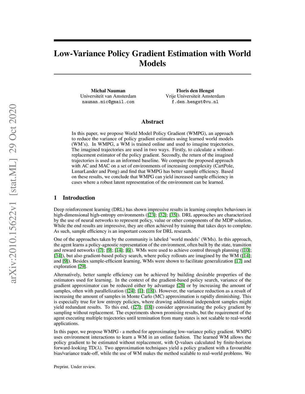 In this paper, we propose World Model Policy Gradient (WMPG), an approach to reduce the variance of policy gradient estimates using learned world models (WM's). In WMPG, a WM is trained online and used to imagine trajectories. The imagined trajectories are used in two ways. Firstly, to calculate a without-replacement estimator of the policy gradient. Secondly, the return of the imagined trajectories is used as an informed baseline. We compare the proposed approach with AC and MAC on a set of environments of increasing complexity (CartPole, LunarLander and Pong) and find that WMPG has better sample efficiency. Based on these results, we conclude that WMPG can yield increased sample efficiency in cases where a robust latent representation of the environment can be learned.