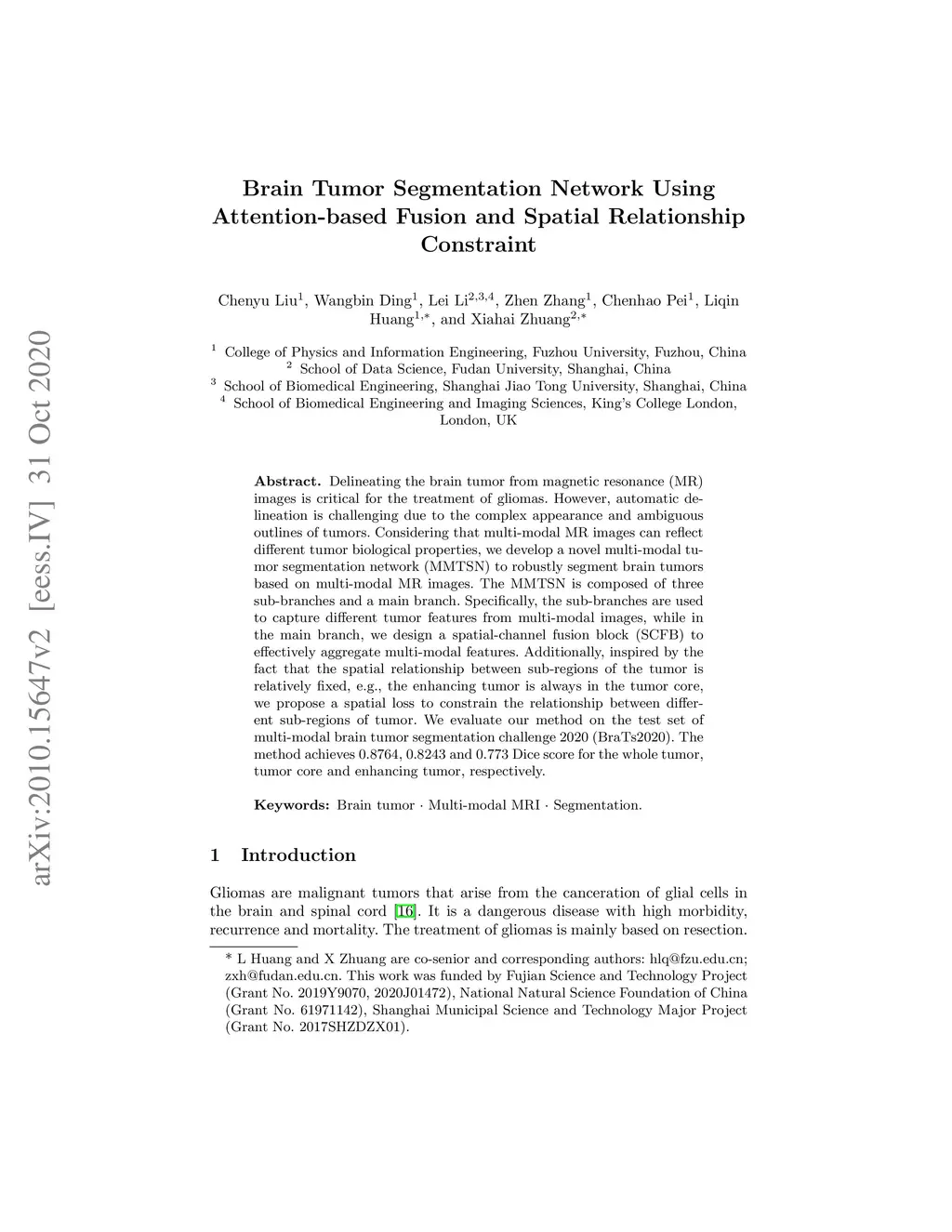 Delineating the brain tumor from magnetic resonance (MR) images is critical for the treatment of gliomas. However, automatic delineation is challenging due to the complex appearance and ambiguous outlines of tumors. Considering that multi-modal MR images can reflect different tumor biological properties, we develop a novel multi-modal tumor segmentation network (MMTSN) to robustly segment brain tumors based on multi-modal MR images. The MMTSN is composed of three sub-branches and a main branch. Specifically, the sub-branches are used to capture different tumor features from multi-modal images, while in the main branch, we design a spatial-channel fusion block (SCFB) to effectively aggregate multi-modal features. Additionally, inspired by the fact that the spatial relationship between sub-regions of tumor is relatively fixed, e.g., the enhancing tumor is always in the tumor core, we propose a spatial loss to constrain the relationship between different sub-regions of tumor. We evaluate our method on the test set of multi-modal brain tumor segmentation challenge 2020 (BraTs2020). The method achieves 0.8764, 0.8243 and 0.773 dice score for whole tumor, tumor core and enhancing tumor, respectively.