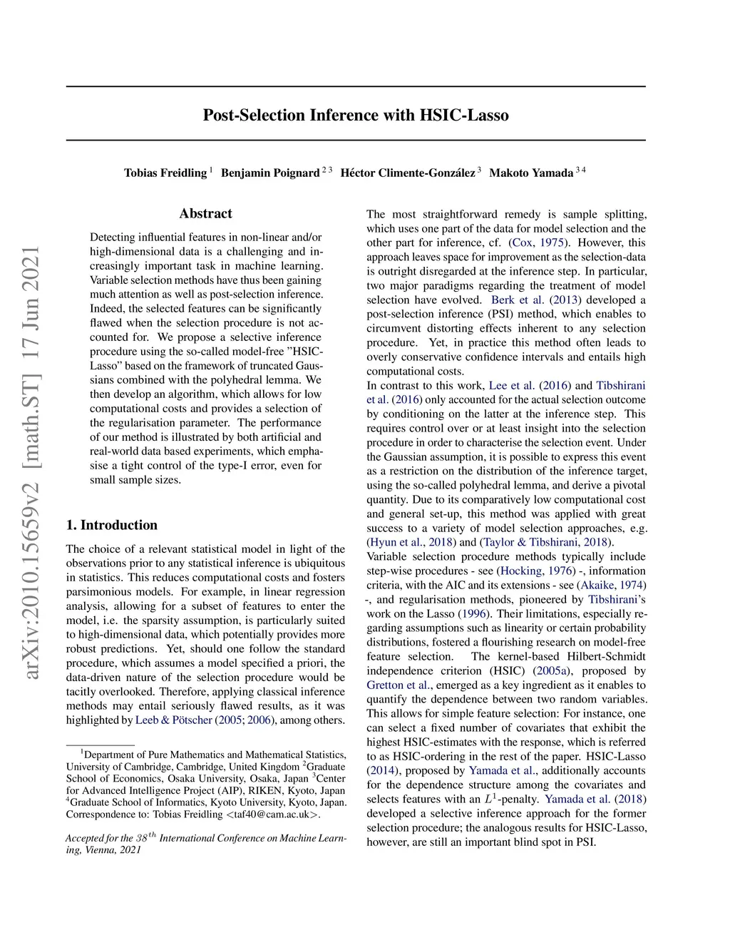 Detecting influential features in non-linear and/or high-dimensional data is a challenging and increasingly important task in machine learning. Variable selection methods have thus been gaining much attention as well as post-selection inference. Indeed, the selected features can be significantly flawed when the selection procedure is not accounted for. We propose a selective inference procedure using the so-called model-free "HSIC-Lasso" based on the framework of truncated Gaussians combined with the polyhedral lemma. We then develop an algorithm, which allows for low computational costs and provides a selection of the regularisation parameter. The performance of our method is illustrated by both artificial and real-world data based experiments, which emphasise a tight control of the type-I error, even for small sample sizes.