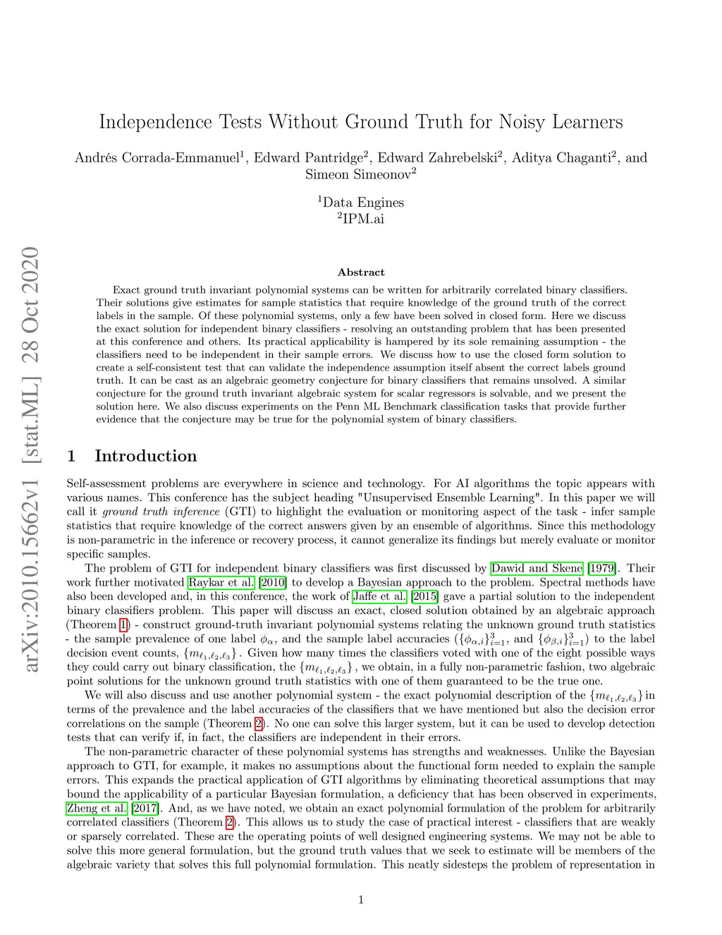 Exact ground truth invariant polynomial systems can be written for arbitrarily correlated binary classifiers. Their solutions give estimates for sample statistics that require knowledge of the ground truth of the correct labels in the sample. Of these polynomial systems, only a few have been solved in closed form. Here we discuss the exact solution for independent binary classifiers - resolving an outstanding problem that has been presented at this conference and others. Its practical applicability is hampered by its sole remaining assumption - the classifiers need to be independent in their sample errors. We discuss how to use the closed form solution to create a self-consistent test that can validate the independence assumption itself absent the correct labels ground truth. It can be cast as an algebraic geometry conjecture for binary classifiers that remains unsolved. A similar conjecture for the ground truth invariant algebraic system for scalar regressors is solvable, and we present the solution here. We also discuss experiments on the Penn ML Benchmark classification tasks that provide further evidence that the conjecture may be true for the polynomial system of binary classifiers.