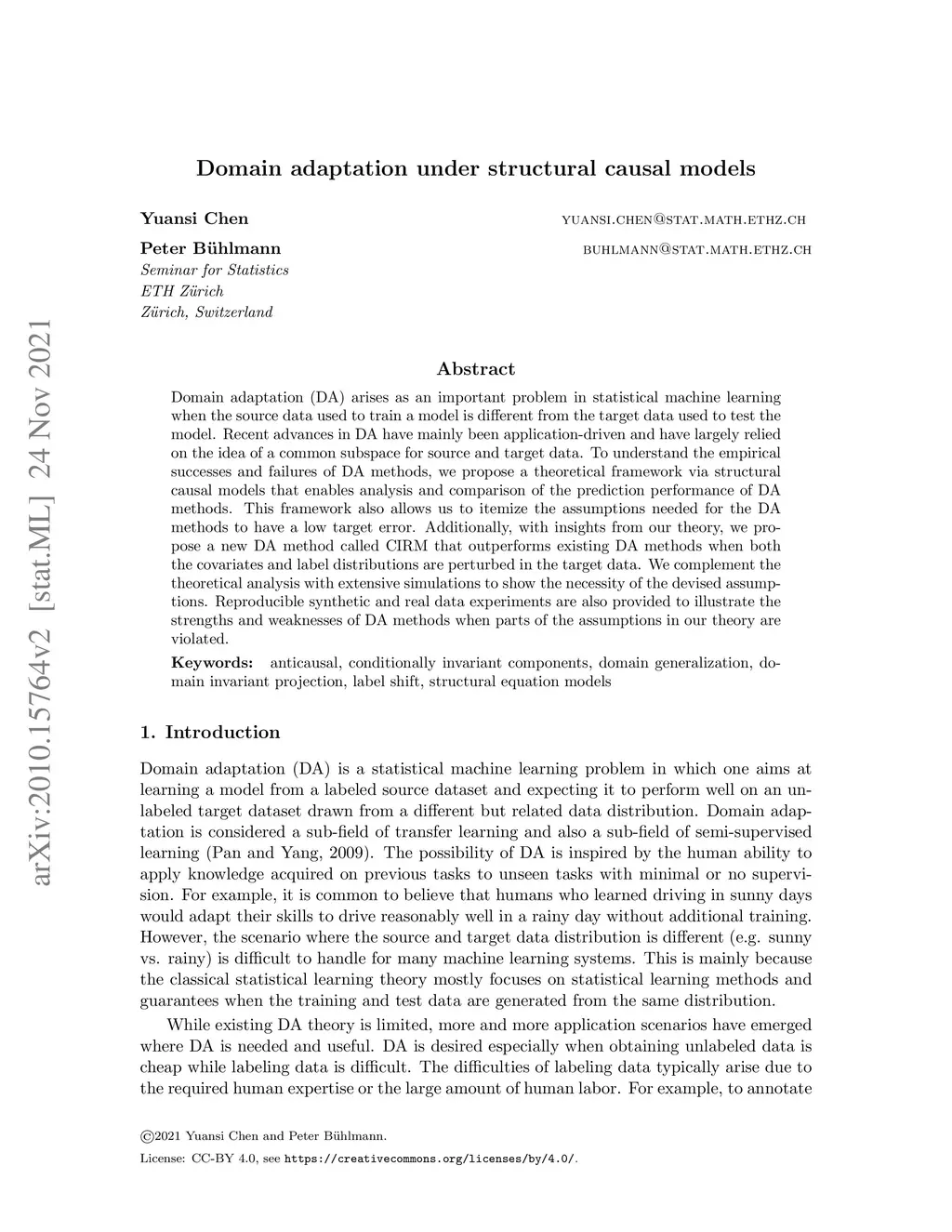 Domain adaptation (DA) arises as an important problem in statistical machine learning when the source data used to train a model is different from the target data used to test the model. Recent advances in DA have mainly been application-driven and have largely relied on the idea of a common subspace for source and target data. To understand the empirical successes and failures of DA methods, we propose a theoretical framework via structural causal models that enables analysis and comparison of the prediction performance of DA methods. This framework also allows us to itemize the assumptions needed for the DA methods to have a low target error. Additionally, with insights from our theory, we propose a new DA method called CIRM that outperforms existing DA methods when both the covariates and label distributions are perturbed in the target data. We complement the theoretical analysis with extensive simulations to show the necessity of the devised assumptions. Reproducible synthetic and real data experiments are also provided to illustrate the strengths and weaknesses of DA methods when parts of the assumptions in our theory are violated.