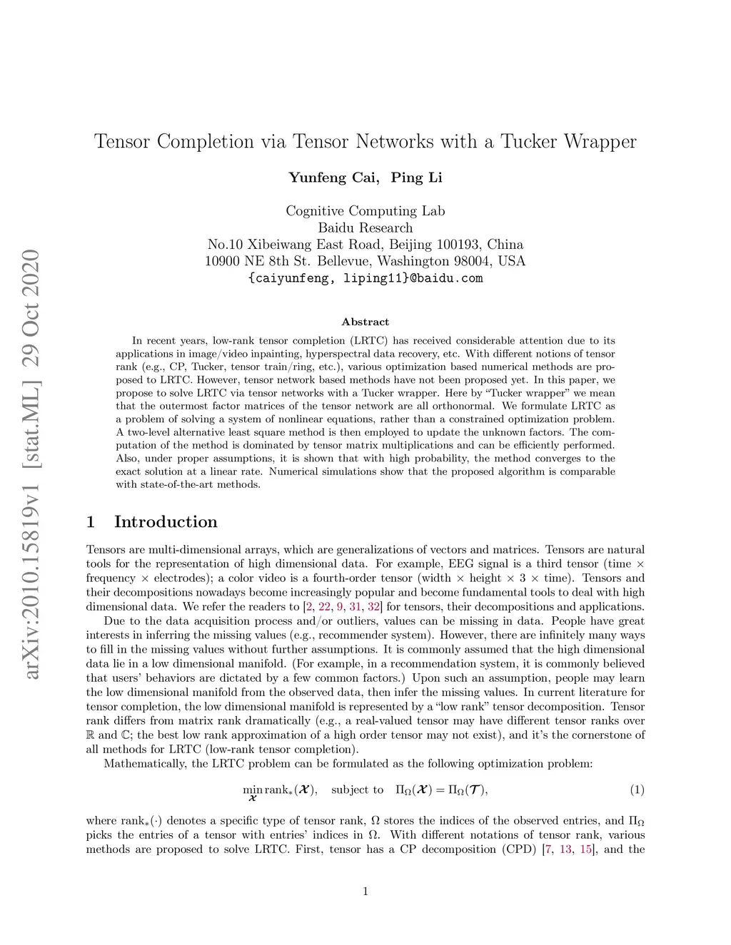 In recent years, low-rank tensor completion (LRTC) has received considerable attention due to its applications in image/video inpainting, hyperspectral data recovery, etc. With different notions of tensor rank (e.g., CP, Tucker, tensor train/ring, etc.), various optimization based numerical methods are proposed to LRTC. However, tensor network based methods have not been proposed yet. In this paper, we propose to solve LRTC via tensor networks with a Tucker wrapper. Here by "Tucker wrapper" we mean that the outermost factor matrices of the tensor network are all orthonormal. We formulate LRTC as a problem of solving a system of nonlinear equations, rather than a constrained optimization problem. A two-level alternative least square method is then employed to update the unknown factors. The computation of the method is dominated by tensor matrix multiplications and can be efficiently performed. Also, under proper assumptions, it is shown that with high probability, the method converges to the exact solution at a linear rate. Numerical simulations show that the proposed algorithm is comparable with state-of-the-art methods.