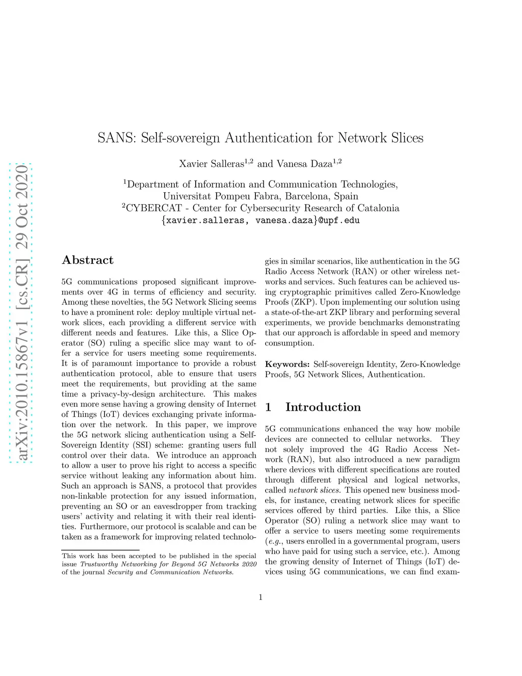 5G communications proposed significant improvements over 4G in terms of efficiency and security. Among these novelties, the 5G Network Slicing seems to have a prominent role: deploy multiple virtual network slices, each providing a different service with different needs and features. Like this, a Slice Operator (SO) ruling a specific slice may want to offer a service for users meeting some requirements. It is of paramount importance to provide a robust authentication protocol, able to ensure that users meet the requirements, but providing at the same time a privacy-by-design architecture. This makes even more sense having a growing density of Internet of Things (IoT) devices exchanging private information over the network. In this paper, we improve the 5G network slicing authentication using a Self-Sovereign Identity (SSI) scheme: granting users full control over their data. We introduce an approach to allow a user to prove his right to access a specific service without leaking any information about him. Such an approach is SANS, a protocol that provides non-linkable protection for any issued information, preventing an SO or an eavesdropper from tracking users' activity and relating it with their real identities. Furthermore, our protocol is scalable and can be taken as a framework for improving related technologies in similar scenarios, like authentication in the 5G Radio Access Network (RAN) or other wireless networks and services. Such features can be achieved using cryptographic primitives called Zero-Knowledge Proofs (ZKP). Upon implementing our solution using a state-of-the-art ZKP library and performing several experiments, we provide benchmarks demonstrating that our approach is affordable in speed and memory consumption.