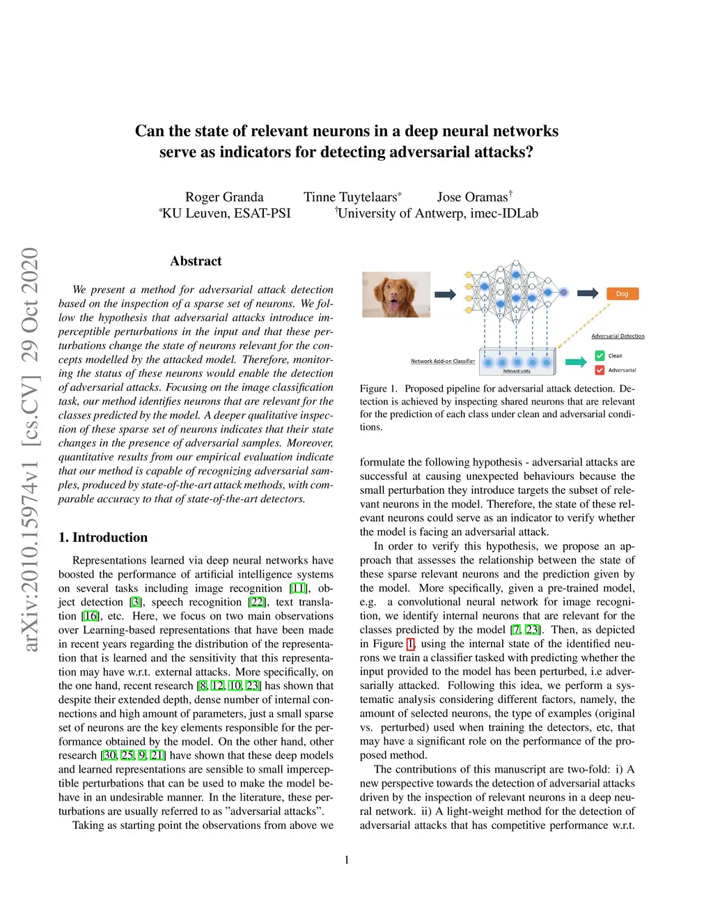 We present a method for adversarial attack detection based on the inspection of a sparse set of neurons. We follow the hypothesis that adversarial attacks introduce imperceptible perturbations in the input and that these perturbations change the state of neurons relevant for the concepts modelled by the attacked model. Therefore, monitoring the status of these neurons would enable the detection of adversarial attacks. Focusing on the image classification task, our method identifies neurons that are relevant for the classes predicted by the model. A deeper qualitative inspection of these sparse set of neurons indicates that their state changes in the presence of adversarial samples. Moreover, quantitative results from our empirical evaluation indicate that our method is capable of recognizing adversarial samples, produced by state-of-the-art attack methods, with comparable accuracy to that of state-of-the-art detectors.