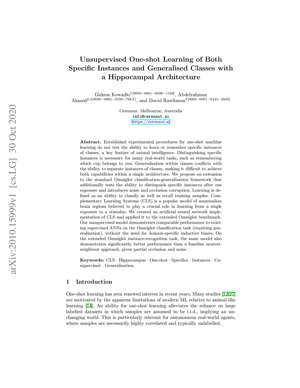 Established experimental procedures for one-shot machine learning do not test the ability to learn or remember specific instances of classes, a key feature of animal intelligence. Distinguishing specific instances is necessary for many real-world tasks, such as remembering which cup belongs to you. Generalisation within classes conflicts with the ability to separate instances of classes, making it difficult to achieve both capabilities within a single architecture. We propose an extension to the standard Omniglot classification-generalisation framework that additionally tests the ability to distinguish specific instances after one exposure and introduces noise and occlusion corruption. Learning is defined as an ability to classify as well as recall training samples. Complementary Learning Systems (CLS) is a popular model of mammalian brain regions believed to play a crucial role in learning from a single exposure to a stimulus. We created an artificial neural network implementation of CLS and applied it to the extended Omniglot benchmark. Our unsupervised model demonstrates comparable performance to existing supervised ANNs on the Omniglot classification task (requiring generalisation), without the need for domain-specific inductive biases. On the extended Omniglot instance-recognition task, the same model also demonstrates significantly better performance than a baseline nearest-neighbour approach, given partial occlusion and noise.