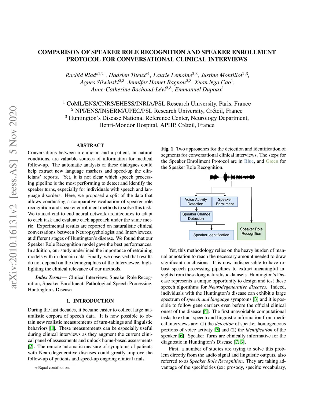 Conversations between a clinician and a patient, in natural conditions, are valuable sources of information for medical follow-up. The automatic analysis of these dialogues could help extract new language markers and speed-up the clinicians' reports. Yet, it is not clear which speech processing pipeline is the most performing to detect and identify the speaker turns, especially for individuals with speech and language disorders. Here, we proposed a split of the data that allows conducting a comparative evaluation of speaker role recognition and speaker enrollment methods to solve this task. We trained end-to-end neural network architectures to adapt to each task and evaluate each approach under the same metric. Experimental results are reported on naturalistic clinical conversations between Neuropsychologist and Interviewees, at different stages of Huntington's disease. We found that our Speaker Role Recognition model gave the best performances. In addition, our study underlined the importance of retraining models with in-domain data. Finally, we observed that results do not depend on the demographics of the Interviewee, highlighting the clinical relevance of our methods.