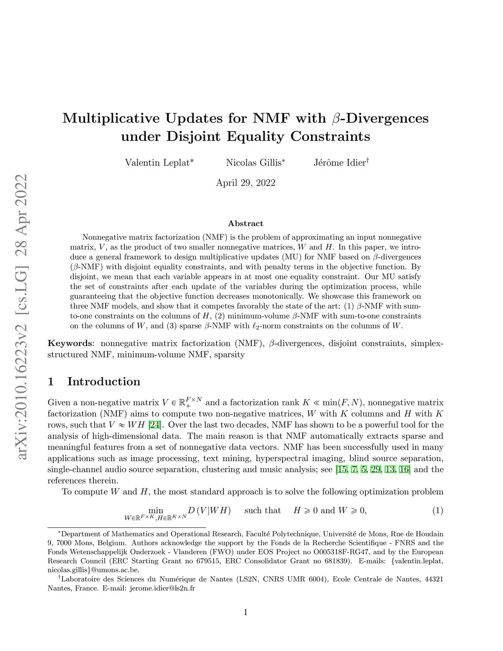 Multiplicative Updates for NMF with -Divergences under Disjoint
