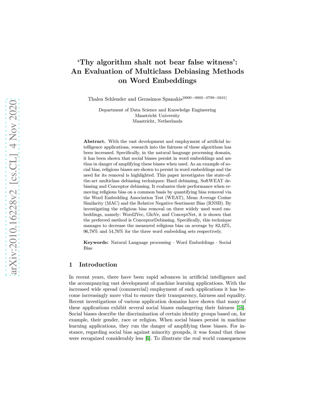 With the vast development and employment of artificial intelligence applications, research into the fairness of these algorithms has been increased. Specifically, in the natural language processing domain, it has been shown that social biases persist in word embeddings and are thus in danger of amplifying these biases when used. As an example of social bias, religious biases are shown to persist in word embeddings and the need for its removal is highlighted. This paper investigates the state-of-the-art multiclass debiasing techniques: Hard debiasing, SoftWEAT debiasing and Conceptor debiasing. It evaluates their performance when removing religious bias on a common basis by quantifying bias removal via the Word Embedding Association Test (WEAT), Mean Average Cosine Similarity (MAC) and the Relative Negative Sentiment Bias (RNSB). By investigating the religious bias removal on three widely used word embeddings, namely: Word2Vec, GloVe, and ConceptNet, it is shown that the preferred method is ConceptorDebiasing. Specifically, this technique manages to decrease the measured religious bias on average by 82,42%, 96,78% and 54,76% for the three word embedding sets respectively.
