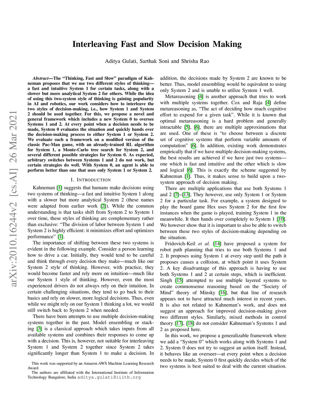 The "Thinking, Fast and Slow" paradigm of Kahneman proposes that we use two different styles of thinking -- a fast and intuitive System 1 for certain tasks, along with a slower but more analytical System 2 for others. While the idea of using this two-system style of thinking is gaining popularity in AI and robotics, our work considers how to interleave the two styles of decision-making, i.e., how System 1 and System 2 should be used together. For this, we propose a novel and general framework which includes a new System 0 to oversee Systems 1 and 2. At every point when a decision needs to be made, System 0 evaluates the situation and quickly hands over the decision-making process to either System 1 or System 2. We evaluate such a framework on a modified version of the classic Pac-Man game, with an already-trained RL algorithm for System 1, a Monte-Carlo tree search for System 2, and several different possible strategies for System 0. As expected, arbitrary switches between Systems 1 and 2 do not work, but certain strategies do well. With System 0, an agent is able to perform better than one that uses only System 1 or System 2.