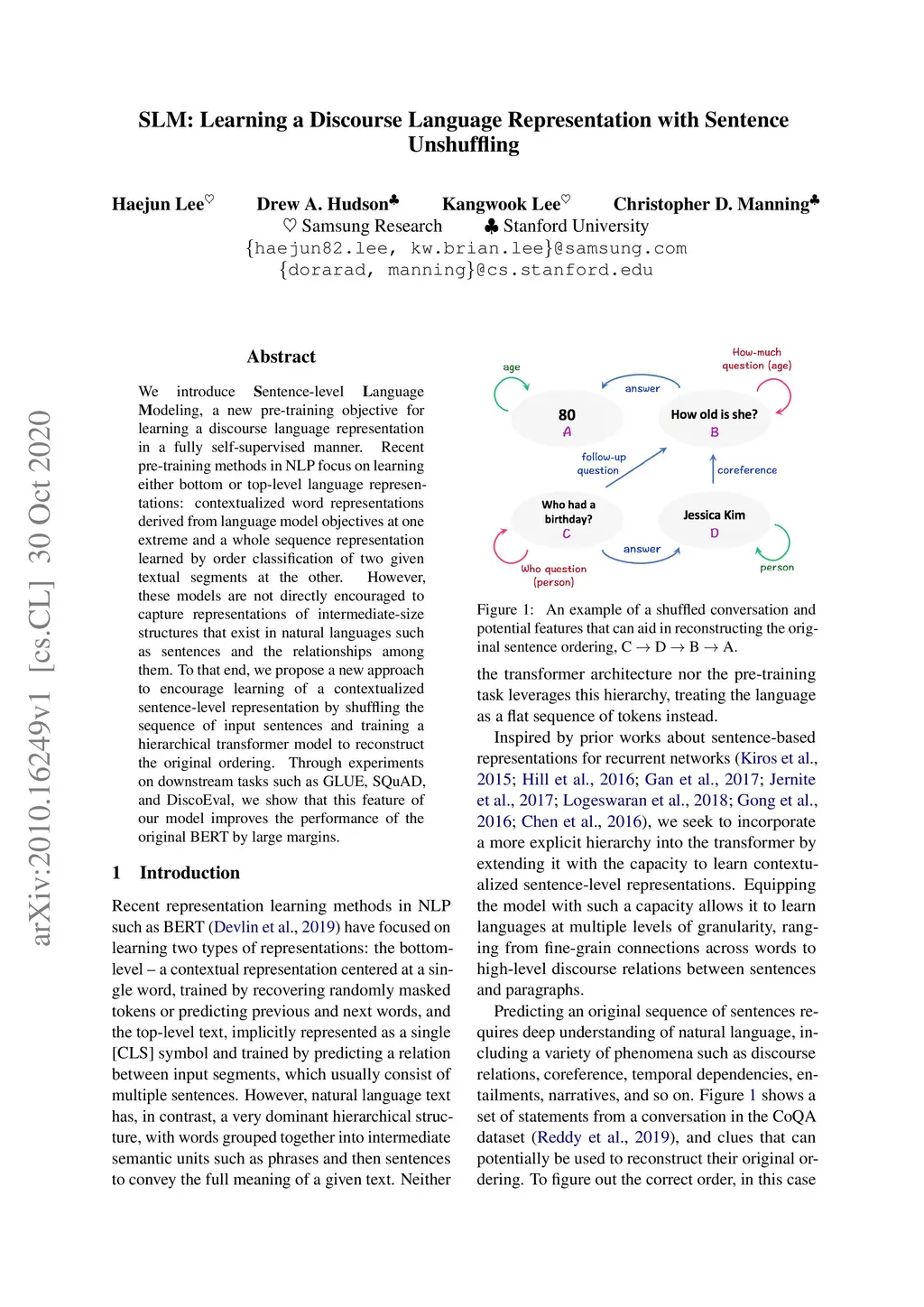 We introduce Sentence-level Language Modeling, a new pre-training objective for learning a discourse language representation in a fully self-supervised manner. Recent pre-training methods in NLP focus on learning either bottom or top-level language representations: contextualized word representations derived from language model objectives at one extreme and a whole sequence representation learned by order classification of two given textual segments at the other. However, these models are not directly encouraged to capture representations of intermediate-size structures that exist in natural languages such as sentences and the relationships among them. To that end, we propose a new approach to encourage learning of a contextualized sentence-level representation by shuffling the sequence of input sentences and training a hierarchical transformer model to reconstruct the original ordering. Through experiments on downstream tasks such as GLUE, SQuAD, and DiscoEval, we show that this feature of our model improves the performance of the original BERT by large margins.