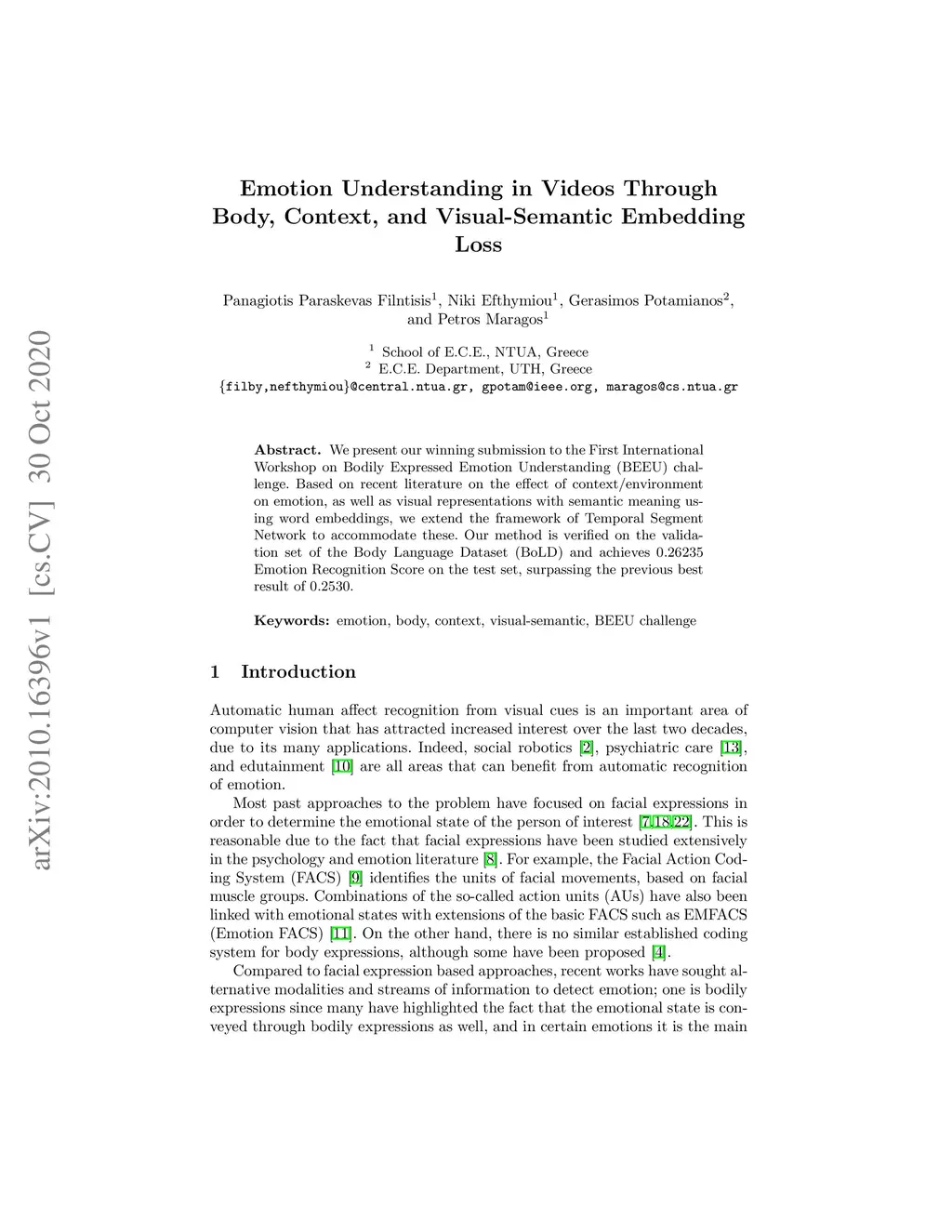 We present our winning submission to the First International Workshop on Bodily Expressed Emotion Understanding (BEEU) challenge. Based on recent literature on the effect of context/environment on emotion, as well as visual representations with semantic meaning using word embeddings, we extend the framework of Temporal Segment Network to accommodate these. Our method is verified on the validation set of the Body Language Dataset (BoLD) and achieves 0.26235 Emotion Recognition Score on the test set, surpassing the previous best result of 0.2530.