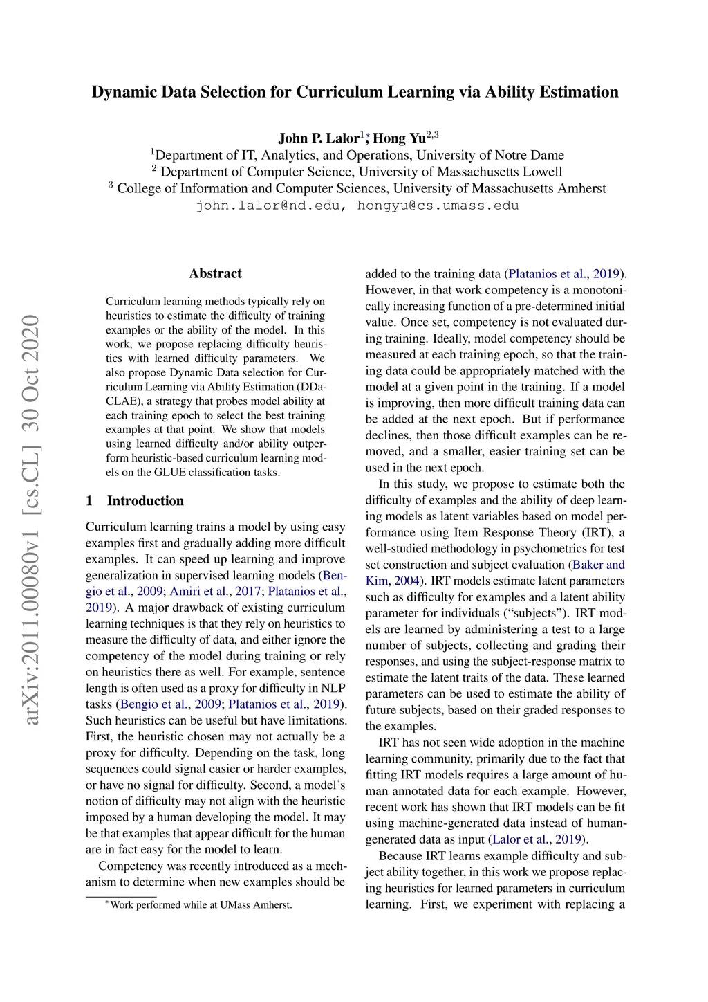 Curriculum learning methods typically rely on heuristics to estimate the difficulty of training examples or the ability of the model. In this work, we propose replacing difficulty heuristics with learned difficulty parameters. We also propose Dynamic Data selection for Curriculum Learning via Ability Estimation (DDaCLAE), a strategy that probes model ability at each training epoch to select the best training examples at that point. We show that models using learned difficulty and/or ability outperform heuristic-based curriculum learning models on the GLUE classification tasks.