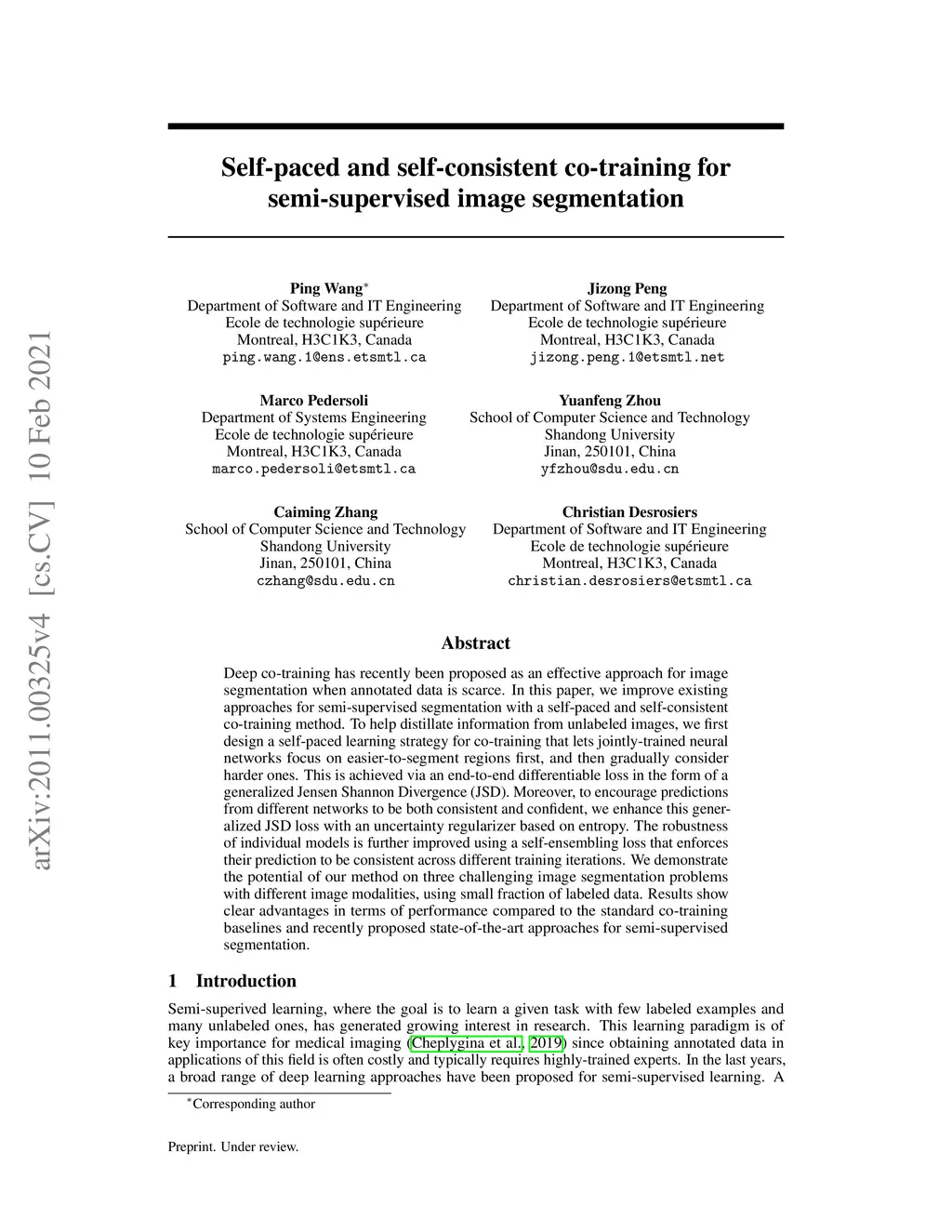 Deep co-training has recently been proposed as an effective approach for image segmentation when annotated data is scarce. In this paper, we improve existing approaches for semi-supervised segmentation with a self-paced and self-consistent co-training method. To help distillate information from unlabeled images, we first design a self-paced learning strategy for co-training that lets jointly-trained neural networks focus on easier-to-segment regions first, and then gradually consider harder ones.This is achieved via an end-to-end differentiable loss inthe form of a generalized Jensen Shannon Divergence(JSD). Moreover, to encourage predictions from different networks to be both consistent and confident, we enhance this generalized JSD loss with an uncertainty regularizer based on entropy. The robustness of individual models is further improved using a self-ensembling loss that enforces their prediction to be consistent across different training iterations. We demonstrate the potential of our method on three challenging image segmentation problems with different image modalities, using small fraction of labeled data. Results show clear advantages in terms of performance compared to the standard co-training baselines and recently proposed state-of-the-art approaches for semi-supervised segmentation