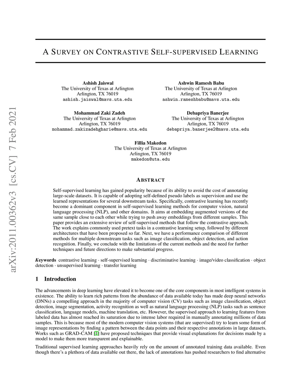 Self-supervised learning has gained popularity because of its ability to avoid the cost of annotating large-scale datasets. It is capable of adopting self-defined pseudo labels as supervision and use the learned representations for several downstream tasks. Specifically, contrastive learning has recently become a dominant component in self-supervised learning methods for computer vision, natural language processing (NLP), and other domains. It aims at embedding augmented versions of the same sample close to each other while trying to push away embeddings from different samples. This paper provides an extensive review of self-supervised methods that follow the contrastive approach. The work explains commonly used pretext tasks in a contrastive learning setup, followed by different architectures that have been proposed so far. Next, we have a performance comparison of different methods for multiple downstream tasks such as image classification, object detection, and action recognition. Finally, we conclude with the limitations of the current methods and the need for further techniques and future directions to make substantial progress.