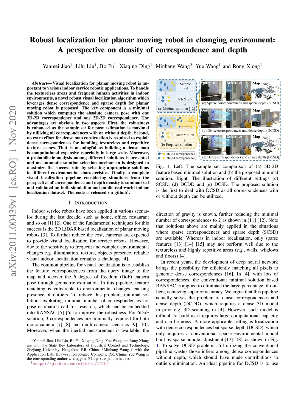 Visual localization for planar moving robot is important to various indoor service robotic applications. To handle the textureless areas and frequent human activities in indoor environments, a novel robust visual localization algorithm which leverages dense correspondence and sparse depth for planar moving robot is proposed. The key component is a minimal solution which computes the absolute camera pose with one 3D-2D correspondence and one 2D-2D correspondence. The advantages are obvious in two aspects. First, the robustness is enhanced as the sample set for pose estimation is maximal by utilizing all correspondences with or without depth. Second, no extra effort for dense map construction is required to exploit dense correspondences for handling textureless and repetitive texture scenes. That is meaningful as building a dense map is computational expensive especially in large scale. Moreover, a probabilistic analysis among different solutions is presented and an automatic solution selection mechanism is designed to maximize the success rate by selecting appropriate solutions in different environmental characteristics. Finally, a complete visual localization pipeline considering situations from the perspective of correspondence and depth density is summarized and validated on both simulation and public real-world indoor localization dataset. The code is released on github.