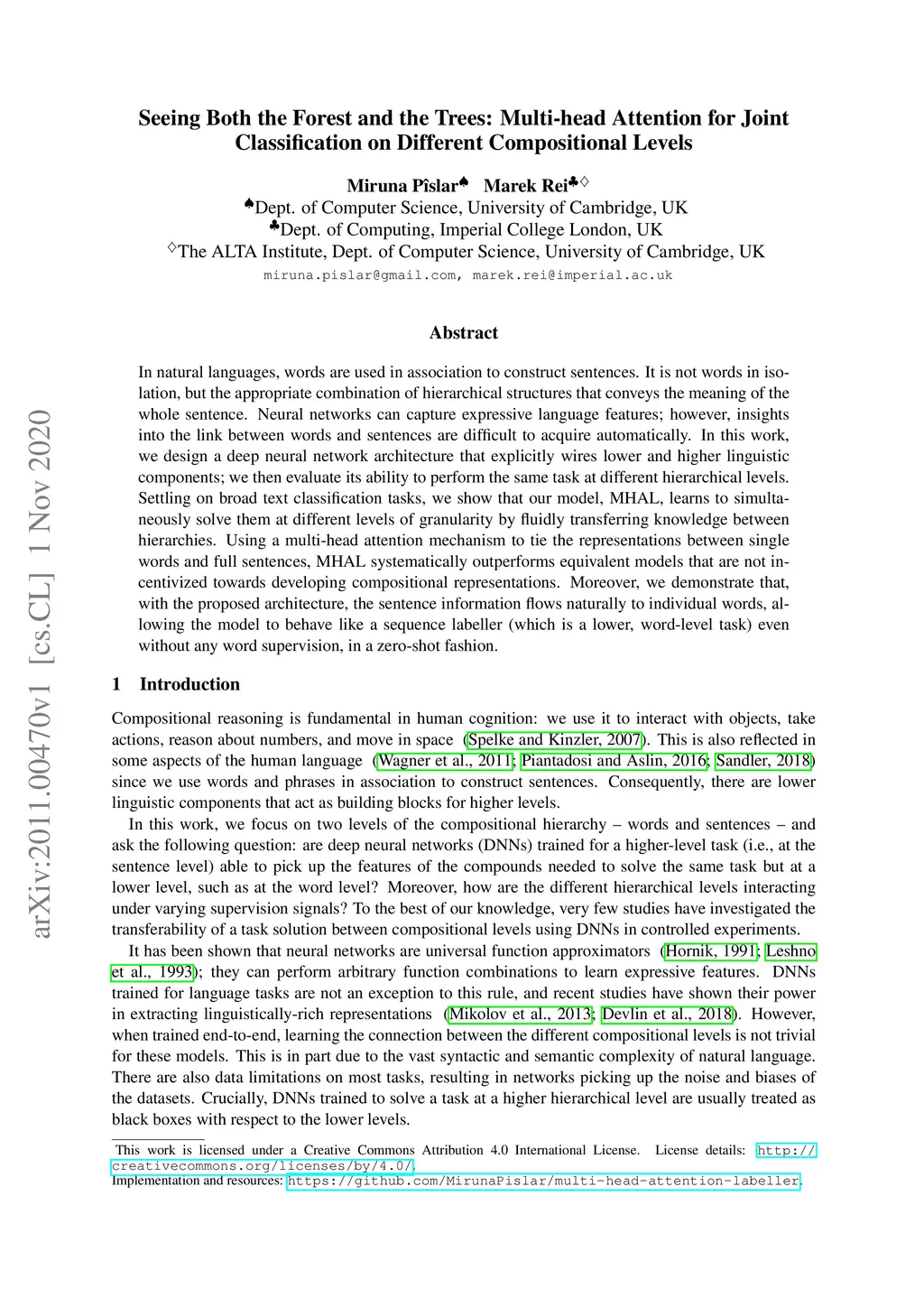In natural languages, words are used in association to construct sentences. It is not words in isolation, but the appropriate combination of hierarchical structures that conveys the meaning of the whole sentence. Neural networks can capture expressive language features; however, insights into the link between words and sentences are difficult to acquire automatically. In this work, we design a deep neural network architecture that explicitly wires lower and higher linguistic components; we then evaluate its ability to perform the same task at different hierarchical levels. Settling on broad text classification tasks, we show that our model, MHAL, learns to simultaneously solve them at different levels of granularity by fluidly transferring knowledge between hierarchies. Using a multi-head attention mechanism to tie the representations between single words and full sentences, MHAL systematically outperforms equivalent models that are not incentivized towards developing compositional representations. Moreover, we demonstrate that, with the proposed architecture, the sentence information flows naturally to individual words, allowing the model to behave like a sequence labeller (which is a lower, word-level task) even without any word supervision, in a zero-shot fashion.