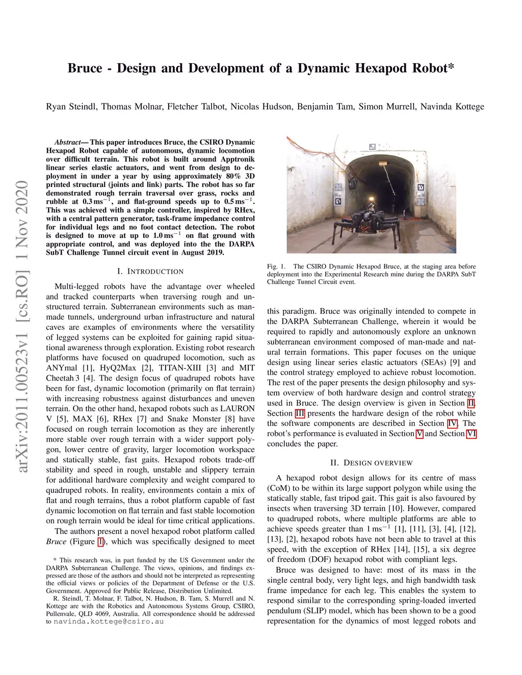 This paper introduces Bruce, the CSIRO Dynamic Hexapod Robot capable of autonomous, dynamic locomotion over difficult terrain. This robot is built around Apptronik linear series elastic actuators, and went from design to deployment in under a year by using approximately 80\% 3D printed structural (joints and link) parts. The robot has so far demonstrated rough terrain traversal over grass, rocks and rubble at 0.3m/s, and flat-ground speeds up to 0.5m/s. This was achieved with a simple controller, inspired by RHex, with a central pattern generator, task-frame impedance control for individual legs and no foot contact detection. The robot is designed to move at up to 1.0m/s on flat ground with appropriate control, and was deployed into the the DARPA SubT Challenge Tunnel circuit event in August 2019.