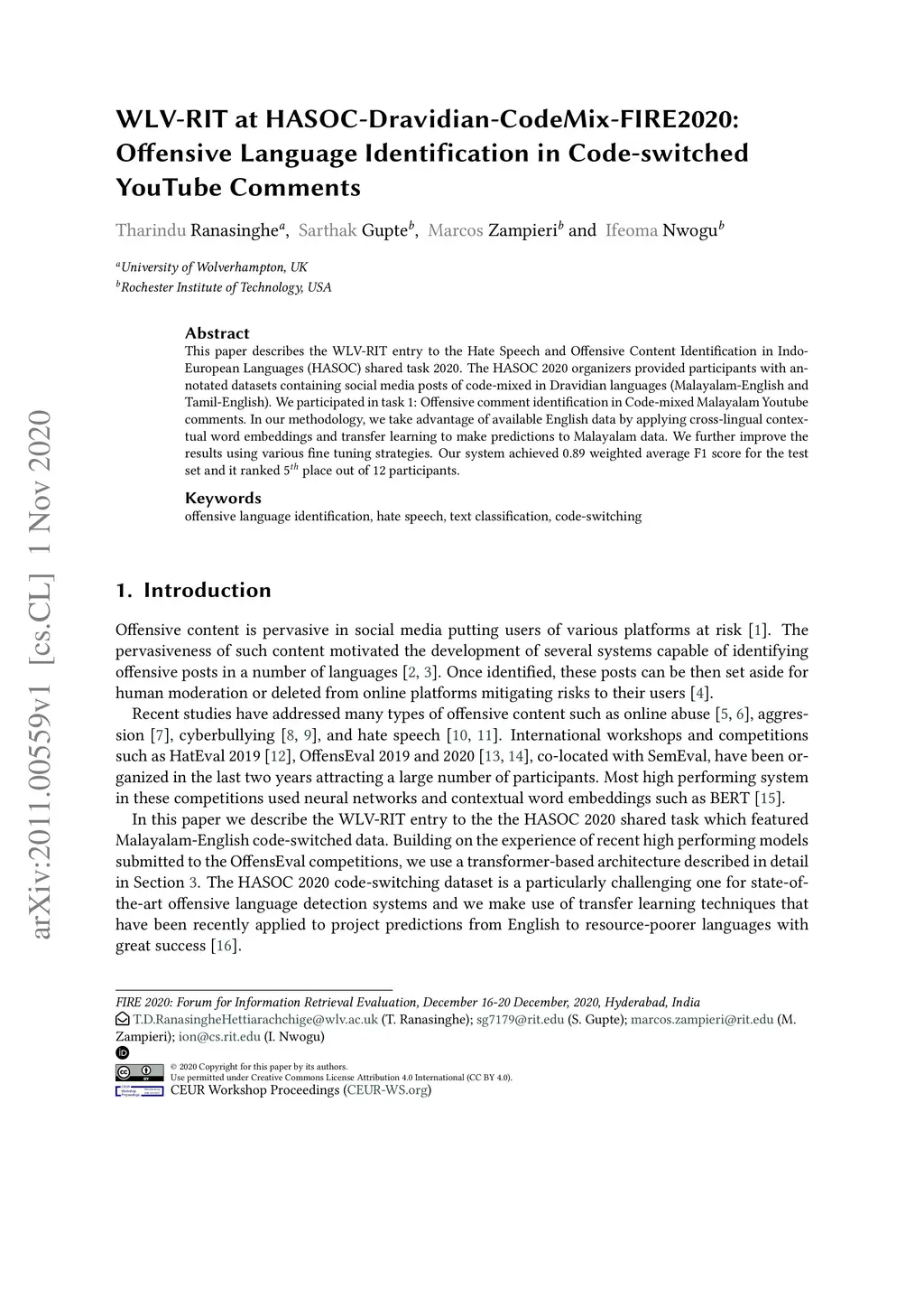 This paper describes the WLV-RIT entry to the Hate Speech and Offensive Content Identification in Indo-European Languages (HASOC) shared task 2020. The HASOC 2020 organizers provided participants with annotated datasets containing social media posts of code-mixed in Dravidian languages (Malayalam-English and Tamil-English). We participated in task 1: Offensive comment identification in Code-mixed Malayalam Youtube comments. In our methodology, we take advantage of available English data by applying cross-lingual contextual word embeddings and transfer learning to make predictions to Malayalam data. We further improve the results using various fine tuning strategies. Our system achieved 0.89 weighted average F1 score for the test set and it ranked 5th place out of 12 participants.