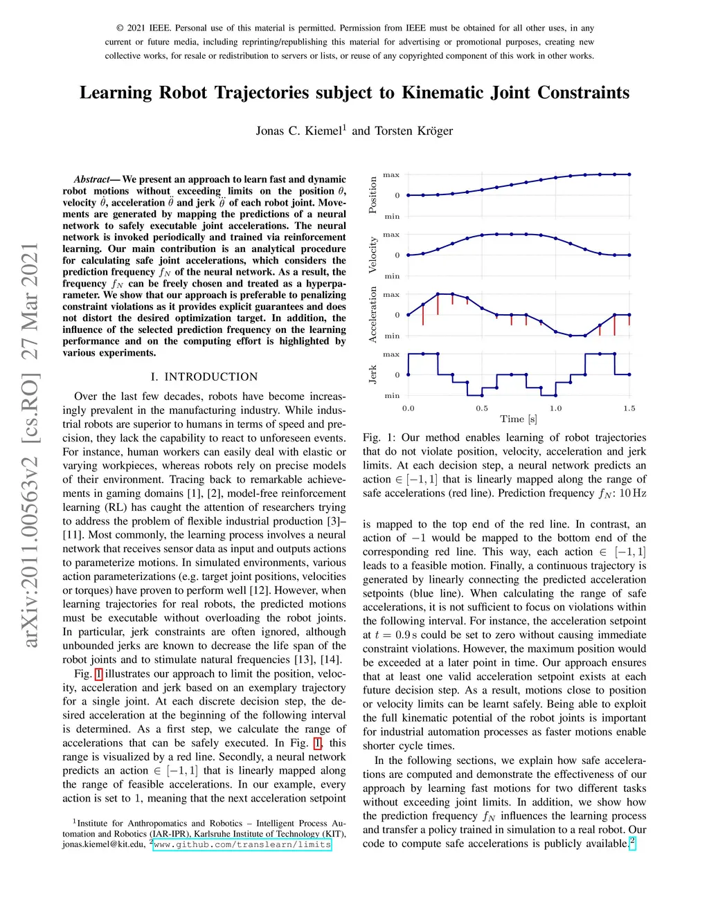 We present an approach to learn fast and dynamic robot motions without exceeding limits on the position , velocity , acceleration and jerk of each robot joint. Movements are generated by mapping the predictions of a neural network to safely executable joint accelerations. The neural network is invoked periodically and trained via reinforcement learning. Our main contribution is an analytical procedure for calculating safe joint accelerations, which considers the prediction frequency of the neural network. As a result, the frequency can be freely chosen and treated as a hyperparameter. We show that our approach is preferable to penalizing constraint violations as it provides explicit guarantees and does not distort the desired optimization target. In addition, the influence of the selected prediction frequency on the learning performance and on the computing effort is highlighted by various experiments.