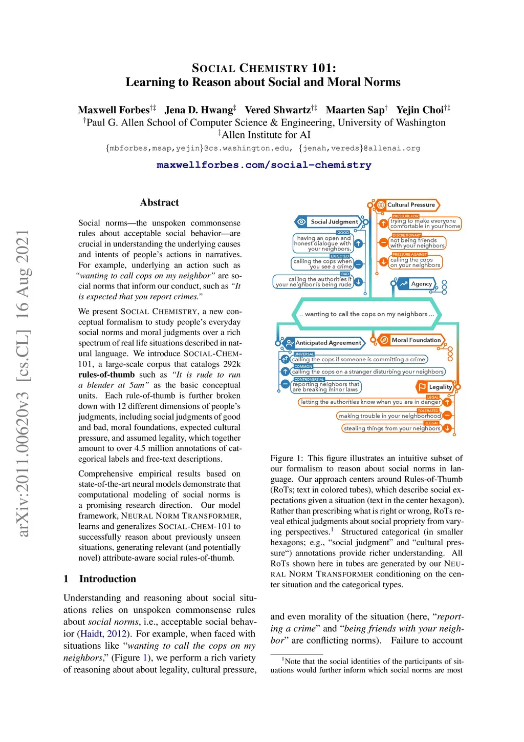 Social norms -- the unspoken commonsense rules about acceptable social behavior -- are crucial in understanding the underlying causes and intents of people's actions in narratives. For example, underlying an action such as "wanting to call cops on my neighbors" are social norms that inform our conduct, such as "It is expected that you report crimes." We present Social Chemistry, a new conceptual formalism to study people's everyday social norms and moral judgments over a rich spectrum of real life situations described in natural language. We introduce Social-Chem-101, a large-scale corpus that catalogs 292k rules-of-thumb such as "it is rude to run a blender at 5am" as the basic conceptual units. Each rule-of-thumb is further broken down with 12 different dimensions of people's judgments, including social judgments of good and bad, moral foundations, expected cultural pressure, and assumed legality, which together amount to over 4.5 million annotations of categorical labels and free-text descriptions. Comprehensive empirical results based on state-of-the-art neural models demonstrate that computational modeling of social norms is a promising research direction. Our model framework, Neural Norm Transformer, learns and generalizes Social-Chem-101 to successfully reason about previously unseen situations, generating relevant (and potentially novel) attribute-aware social rules-of-thumb.