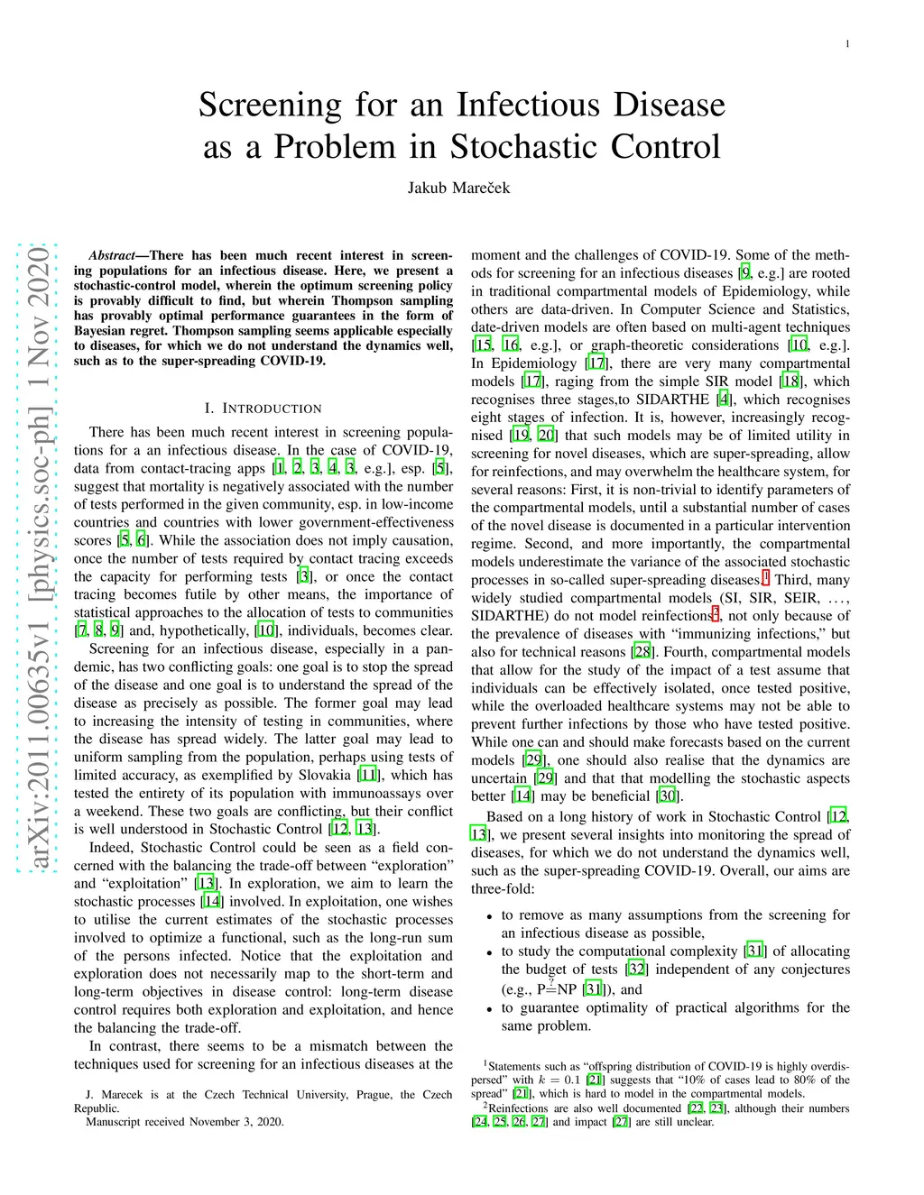 There has been much recent interest in screening populations for an infectious disease. Here, we present a stochastic-control model, wherein the optimum screening policy is provably difficult to find, but wherein Thompson sampling has provably optimal performance guarantees in the form of Bayesian regret. Thompson sampling seems applicable especially to diseases, for which we do not understand the dynamics well, such as to the super-spreading COVID-19.