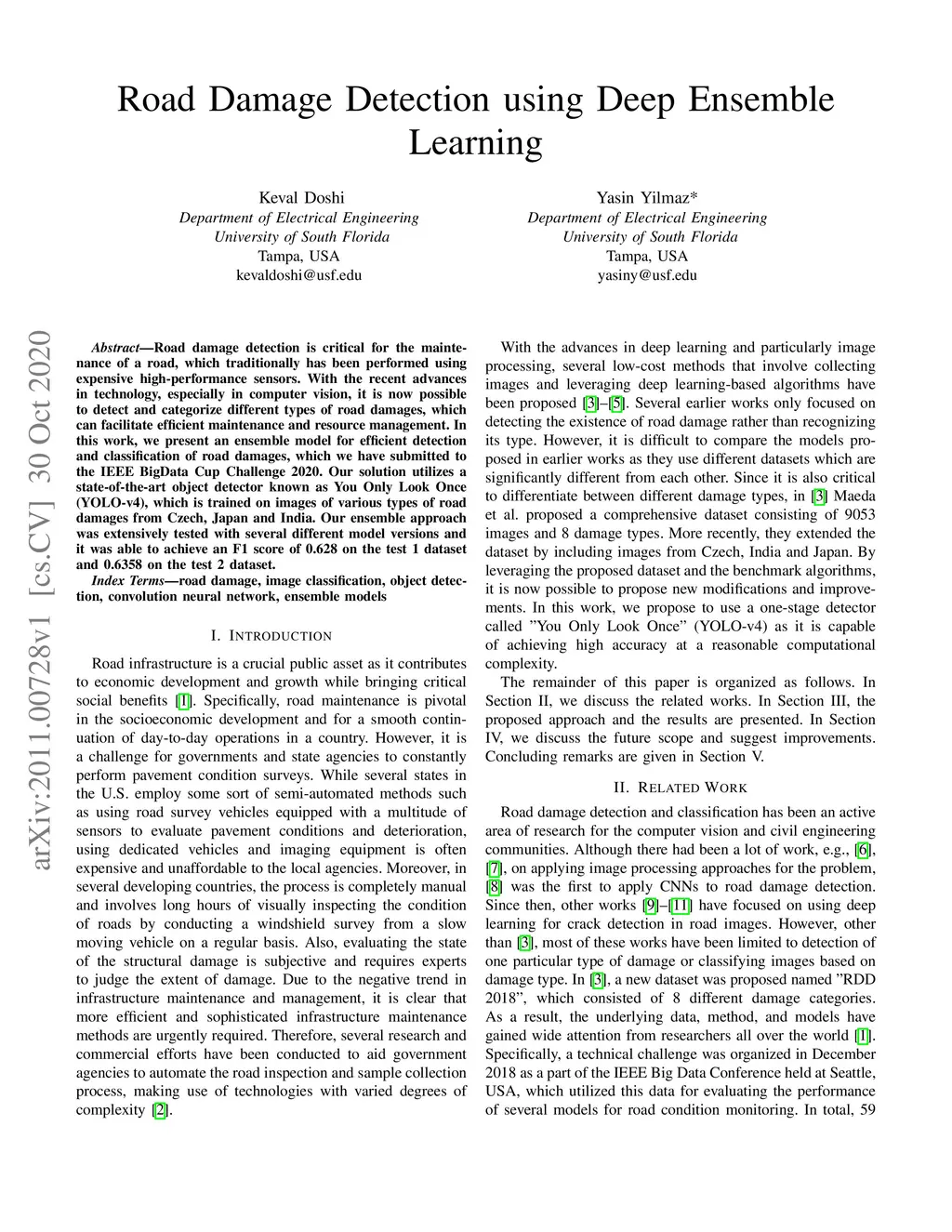 Road damage detection is critical for the maintenance of a road, which traditionally has been performed using expensive high-performance sensors. With the recent advances in technology, especially in computer vision, it is now possible to detect and categorize different types of road damages, which can facilitate efficient maintenance and resource management. In this work, we present an ensemble model for efficient detection and classification of road damages, which we have submitted to the IEEE BigData Cup Challenge 2020. Our solution utilizes a state-of-the-art object detector known as You Only Look Once (YOLO-v4), which is trained on images of various types of road damages from Czech, Japan and India. Our ensemble approach was extensively tested with several different model versions and it was able to achieve an F1 score of 0.628 on the test 1 dataset and 0.6358 on the test 2 dataset.