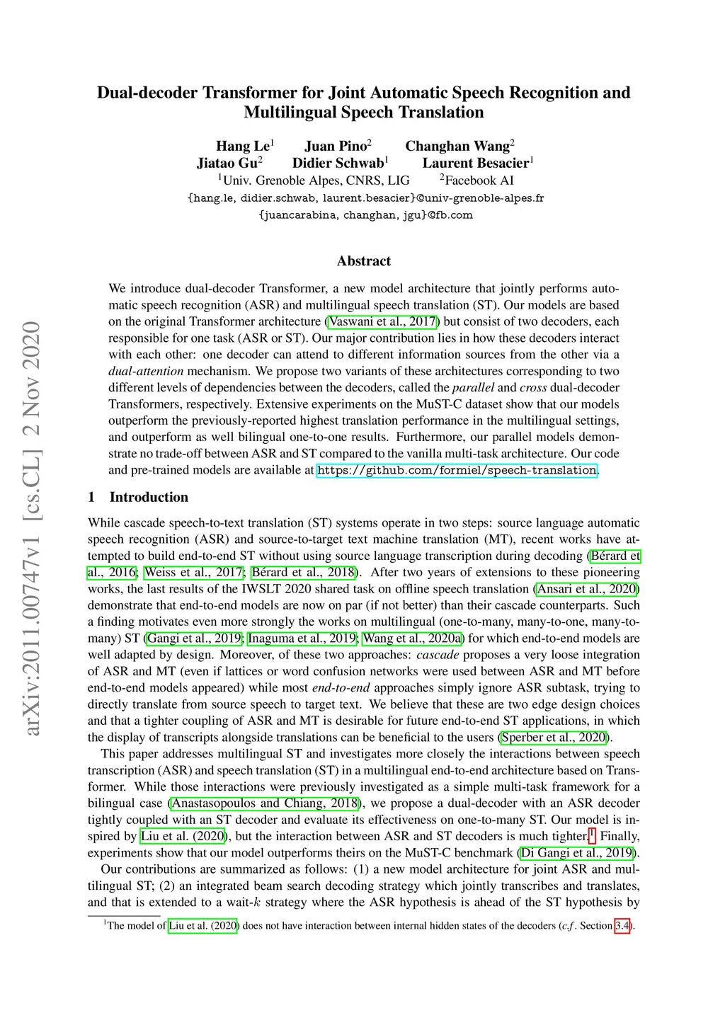 Dual-decoder Transformer for Joint Automatic Speech Recognition and