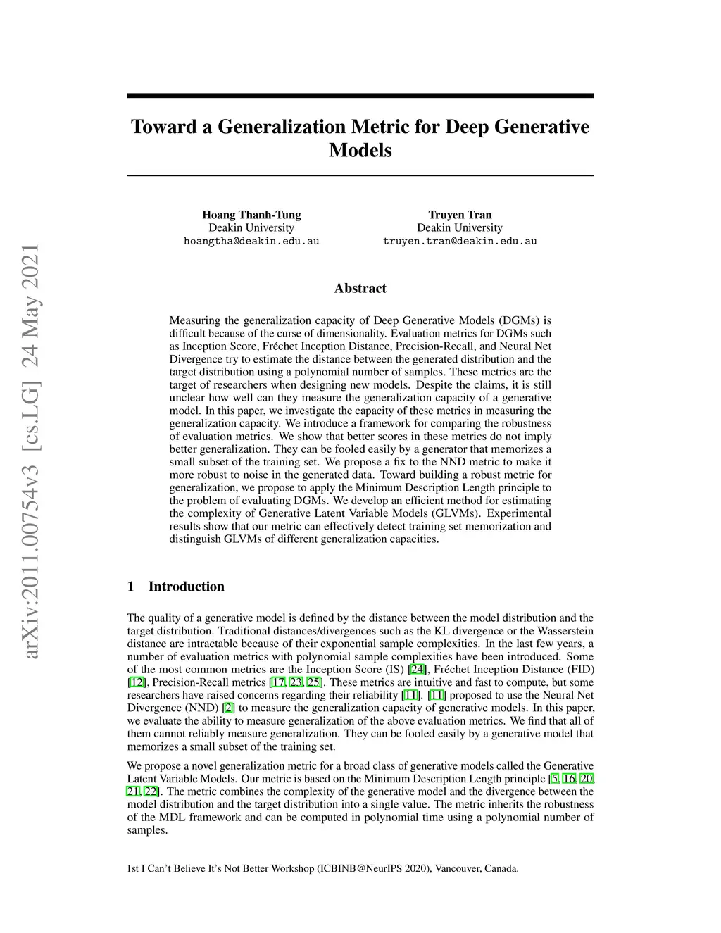 Toward a Generalization Metric for Deep Generative Models