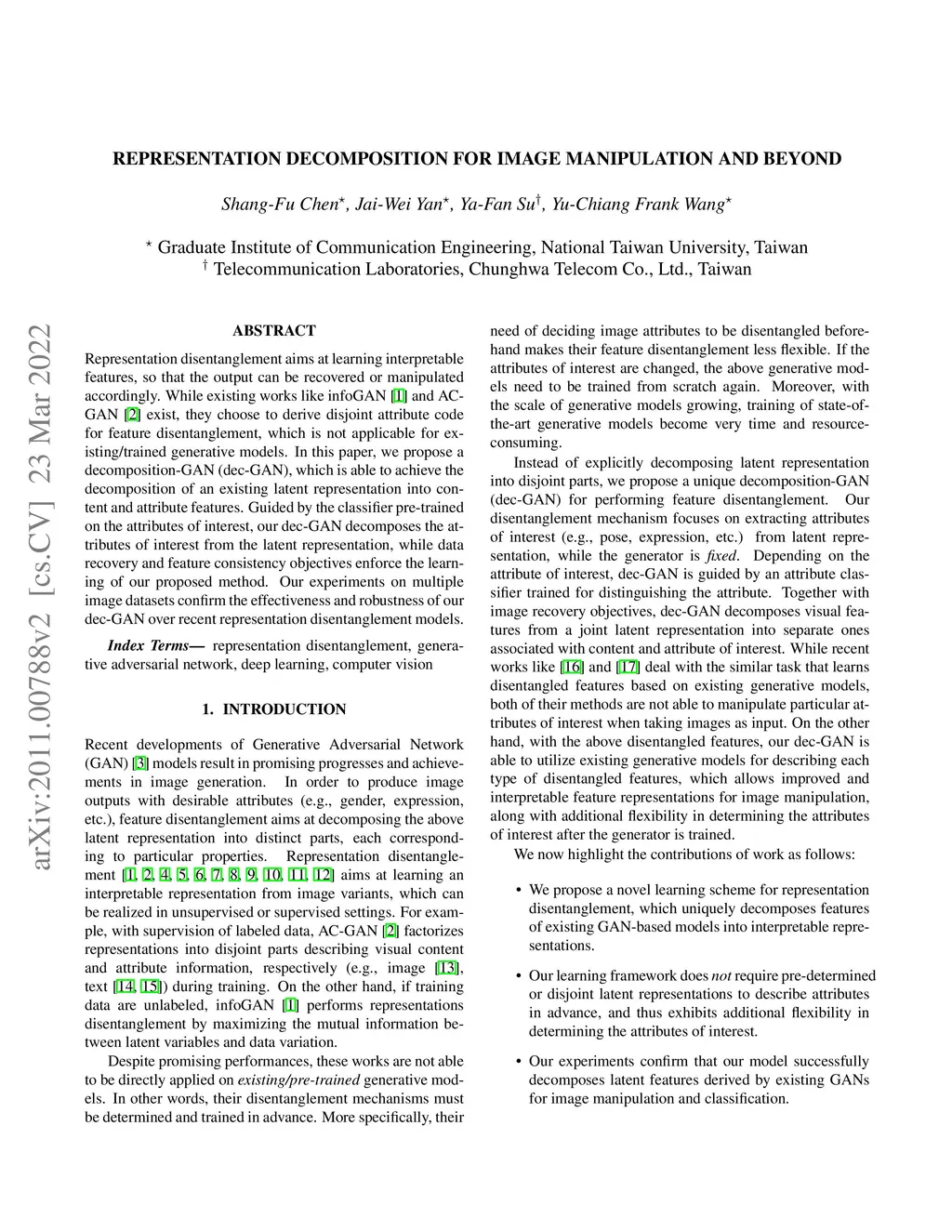Representation disentanglement aims at learning interpretable features, so that the output can be recovered or manipulated accordingly. While existing works like infoGAN and AC-GAN exist, they choose to derive disjoint attribute code for feature disentanglement, which is not applicable for existing/trained generative models. In this paper, we propose a decomposition-GAN (dec-GAN), which is able to achieve the decomposition of an existing latent representation into content and attribute features. Guided by the classifier pre-trained on the attributes of interest, our dec-GAN decomposes the attributes of interest from the latent representation, while data recovery and feature consistency objectives enforce the learning of our proposed method. Our experiments on multiple image datasets confirm the effectiveness and robustness of our dec-GAN over recent representation disentanglement models.