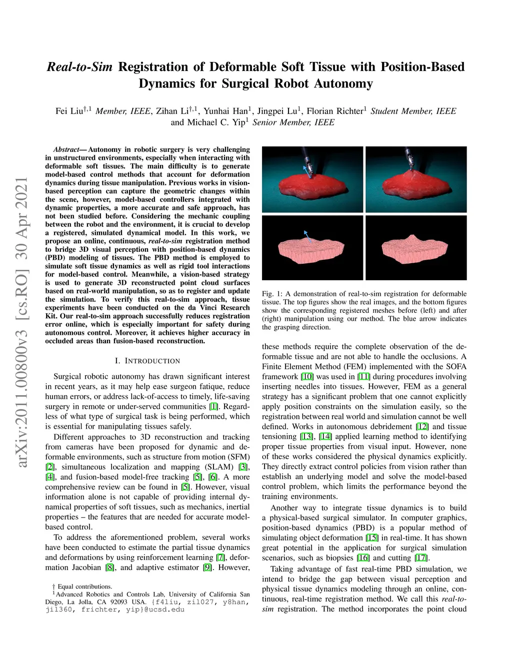 Autonomy in robotic surgery is very challenging in unstructured environments, especially when interacting with deformable soft tissues. The main difficulty is to generate model-based control methods that account for deformation dynamics during tissue manipulation. Previous works in vision-based perception can capture the geometric changes within the scene, however, model-based controllers integrated with dynamic properties, a more accurate and safe approach, has not been studied before. Considering the mechanic coupling between the robot and the environment, it is crucial to develop a registered, simulated dynamical model. In this work, we propose an online, continuous, real-to-sim registration method to bridge 3D visual perception with position-based dynamics (PBD) modeling of tissues. The PBD method is employed to simulate soft tissue dynamics as well as rigid tool interactions for model-based control. Meanwhile, a vision-based strategy is used to generate 3D reconstructed point cloud surfaces based on real-world manipulation, so as to register and update the simulation. To verify this real-to-sim approach, tissue experiments have been conducted on the da Vinci Research Kit. Our real-to-sim approach successfully reduces registration error online, which is especially important for safety during autonomous control. Moreover, it achieves higher accuracy in occluded areas than fusion-based reconstruction.