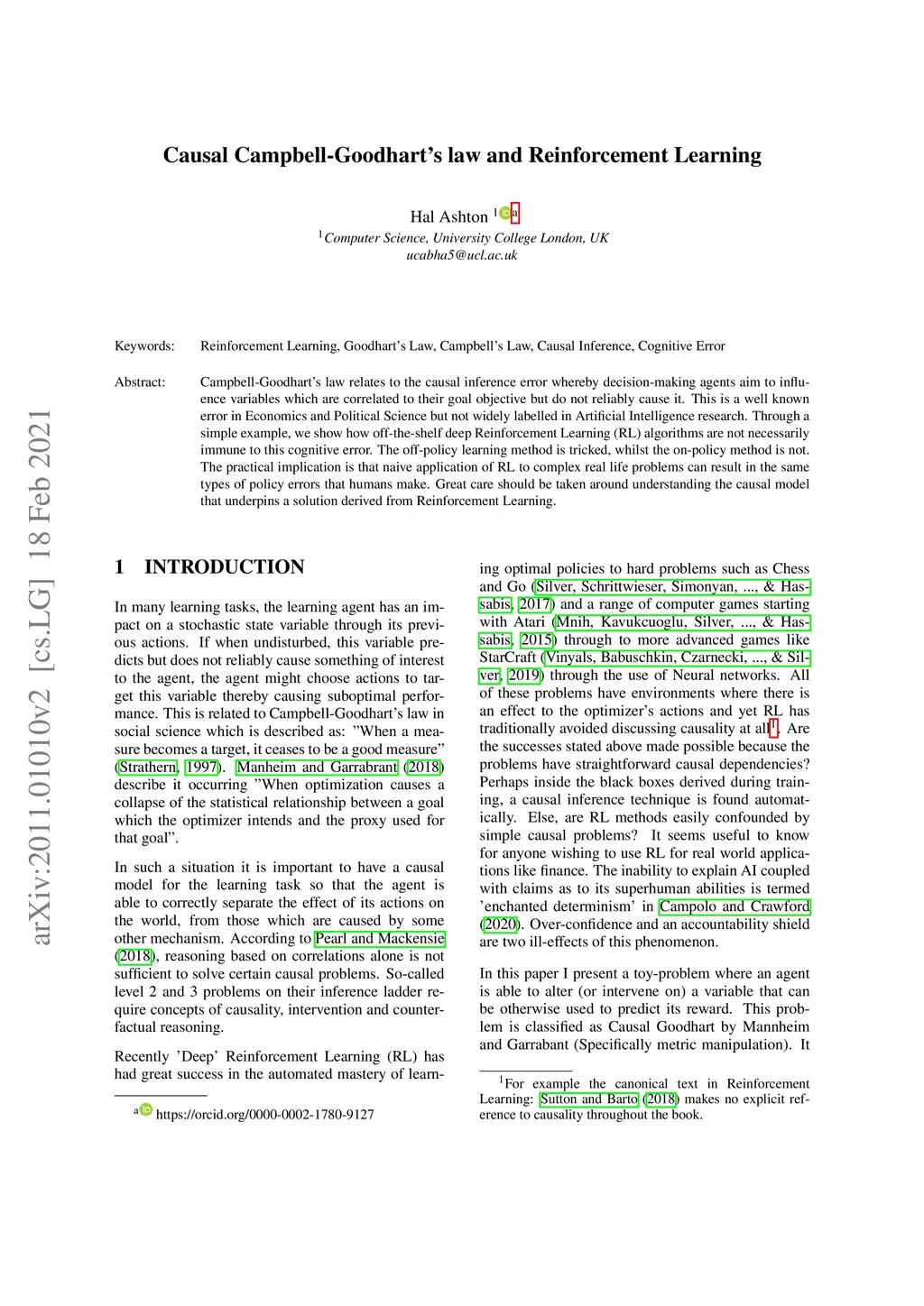 Campbell-Goodhart's law relates to the causal inference error whereby decision-making agents aim to influence variables which are correlated to their goal objective but do not reliably cause it. This is a well known error in Economics and Political Science but not widely labelled in Artificial Intelligence research. Through a simple example, we show how off-the-shelf deep Reinforcement Learning (RL) algorithms are not necessarily immune to this cognitive error. The off-policy learning method is tricked, whilst the on-policy method is not. The practical implication is that naive application of RL to complex real life problems can result in the same types of policy errors that humans make. Great care should be taken around understanding the causal model that underpins a solution derived from Reinforcement Learning.