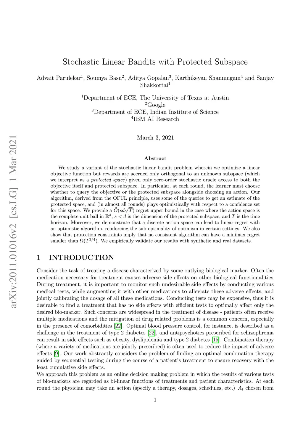 We study a variant of the stochastic linear bandit problem wherein we optimize a linear objective function but rewards are accrued only orthogonal to an unknown subspace (which we interpret as a \textit{protected space}) given only zero-order stochastic oracle access to both the objective itself and protected subspace. In particular, at each round, the learner must choose whether to query the objective or the protected subspace alongside choosing an action. Our algorithm, derived from the OFUL principle, uses some of the queries to get an estimate of the protected space, and (in almost all rounds) plays optimistically with respect to a confidence set for this space. We provide a regret upper bound in the case where the action space is the complete unit ball in , is the dimension of the protected subspace, and is the time horizon. Moreover, we demonstrate that a discrete action space can lead to linear regret with an optimistic algorithm, reinforcing the sub-optimality of optimism in certain settings. We also show that protection constraints imply that for certain settings, no consistent algorithm can have a regret smaller than We finally empirically validate our results with synthetic and real datasets.