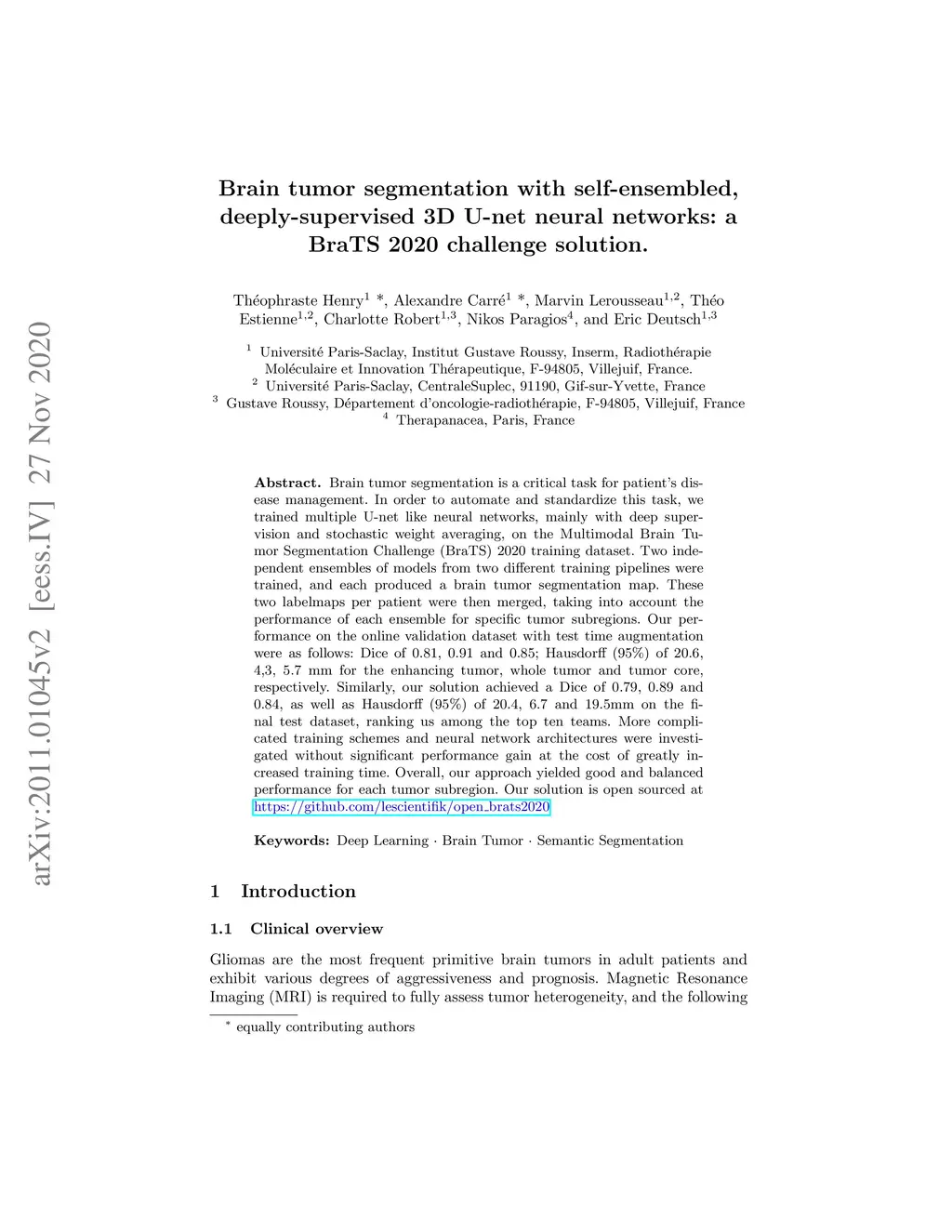 Brain tumor segmentation is a critical task for patient's disease management. In order to automate and standardize this task, we trained multiple U-net like neural networks, mainly with deep supervision and stochastic weight averaging, on the Multimodal Brain Tumor Segmentation Challenge (BraTS) 2020 training dataset. Two independent ensembles of models from two different training pipelines were trained, and each produced a brain tumor segmentation map. These two labelmaps per patient were then merged, taking into account the performance of each ensemble for specific tumor subregions. Our performance on the online validation dataset with test time augmentation were as follows: Dice of 0.81, 0.91 and 0.85; Hausdorff (95%) of 20.6, 4,3, 5.7 mm for the enhancing tumor, whole tumor and tumor core, respectively. Similarly, our solution achieved a Dice of 0.79, 0.89 and 0.84, as well as Hausdorff (95%) of 20.4, 6.7 and 19.5mm on the final test dataset, ranking us among the top ten teams. More complicated training schemes and neural network architectures were investigated without significant performance gain at the cost of greatly increased training time. Overall, our approach yielded good and balanced performance for each tumor subregion. Our solution is open sourced at https://github.com/lescientifik/open_brats2020.