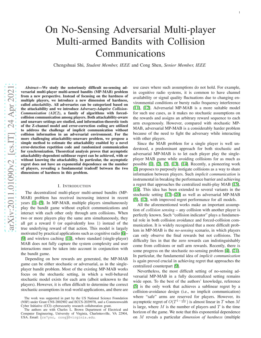 We study the notoriously difficult no-sensing adversarial multi-player multi-armed bandits (MP-MAB) problem from a new perspective. Instead of focusing on the hardness of multiple players, we introduce a new dimension of hardness, called attackability. All adversaries can be categorized based on the attackability and we introduce Adversary-Adaptive Collision-Communication (A2C2), a family of algorithms with forced-collision communication among players. Both attackability-aware and unaware settings are studied, and information-theoretic tools of the Z-channel model and error-correction coding are utilized to address the challenge of implicit communication without collision information in an adversarial environment. For the more challenging attackability-unaware problem, we propose a simple method to estimate the attackability enabled by a novel error-detection repetition code and randomized communication for synchronization. Theoretical analysis proves that asymptotic attackability-dependent sublinear regret can be achieved, with or without knowing the attackability. In particular, the asymptotic regret does not have an exponential dependence on the number of players, revealing a fundamental tradeoff between the two dimensions of hardness in this problem.