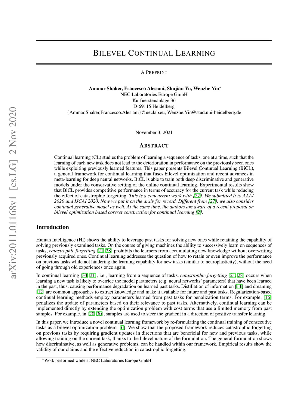 Continual learning (CL) studies the problem of learning a sequence of tasks, one at a time, such that the learning of each new task does not lead to the deterioration in performance on the previously seen ones while exploiting previously learned features. This paper presents Bilevel Continual Learning (BiCL), a general framework for continual learning that fuses bilevel optimization and recent advances in meta-learning for deep neural networks. BiCL is able to train both deep discriminative and generative models under the conservative setting of the online continual learning. Experimental results show that BiCL provides competitive performance in terms of accuracy for the current task while reducing the effect of catastrophic forgetting. This is a concurrent work with [1]. We submitted it to AAAI 2020 and IJCAI 2020. Now we put it on the arxiv for record. Different from [1], we also consider continual generative model as well. At the same time, the authors are aware of a recent proposal on bilevel optimization based coreset construction for continual learning [2]. [1] Q. Pham, D. Sahoo, C. Liu, and S. C. Hoi. Bilevel continual learning. arXiv preprint arXiv:2007.15553, 2020. [2] Z. Borsos, M. Mutny, and A. Krause. Coresets via bilevel optimization for continual learning and streaming. arXiv preprint arXiv:2006.03875, 2020
